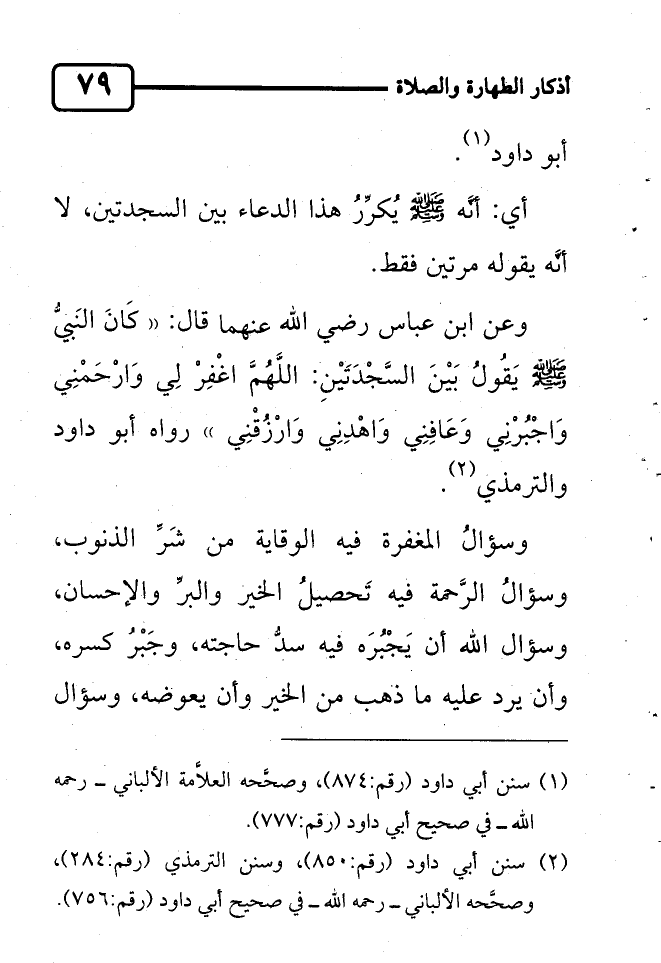 وعن ابن عباس رضي الله عنهما قال: "كَانَ النَبيُّ صلى الله عليه وسلم يَقُولُ بَيْنَ السَّجْدَتَيْنِ: اللَّهُمَّ اغْفِرْ لِي وَارْحَمْنِي وَاجْبُرْنِي وَعَافِنِي وَاهْدِنِي وَارْزُقْنِي" رواه أبو داود والترمذي2.