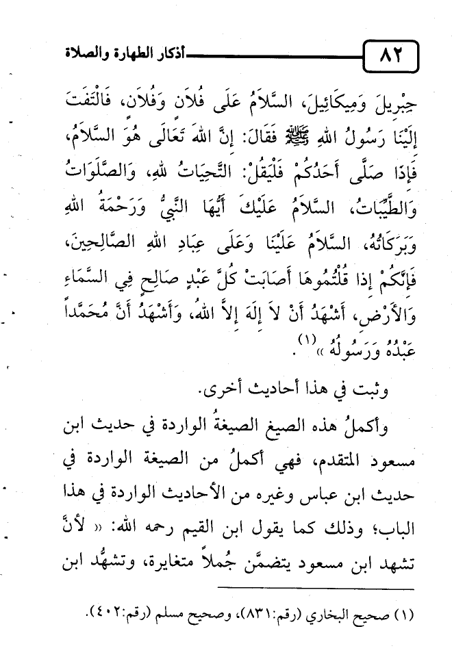 جِبْرِيلَ وَمِيكَائِيلَ، السَّلاَمُ عَلَى فُلاَنٍ وَفُلاَنٍ، فَالْتَفَتَ إِلَيْنَا رَسُولُ اللهِ صلى الله عليه وسلم فَقَالَ: إِنَّ اللهَ تَعَالَى هُوَ السَّلاَمُ، فَإِذَا صَلَّى أَحَدُكُمْ فَلْيَقُلْ: التَّحِيَاتُ للهِ، وَالصَّلَوَاتُ وَالطَّيِّبَاتُ، السَّلاَمُ عَلَيْكَ أَيُّهَا النَّبيُّ وَرَحْمَةُ اللهِ وَبَرَكَاتُهُ، السَّلاَمُ عَلَيْنَا وَعَلَى عِبَادِ اللهِ الصَّالِحِينَ، فَإِنَّكُمْ إِذا قُلْتُمُوهَا أَصَابَتْ كُلَّ عَبْدٍ صَالِحٍ فِي السَّمَاءِ وَالأَرْضِ، أَشْهَدُ أَنْ لاَ إِلَهَ إِلاَّ اللهُ، وَأَشْهَدُ أَنَّ مُحَمَّداً عَبْدُهُ وَرَسُولُهُ" 1.