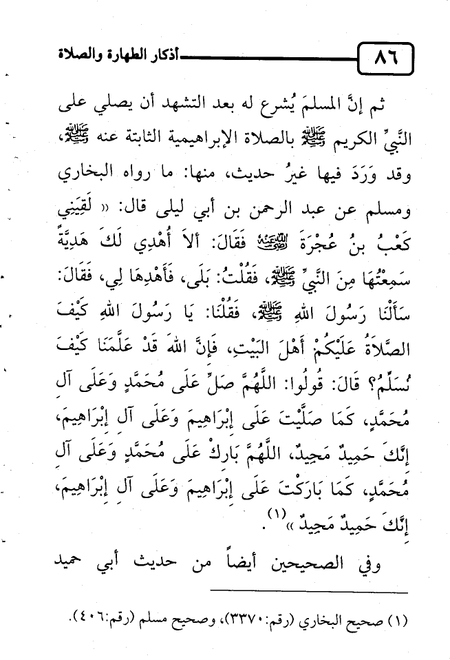 ثم إنَّ المسلمَ يُشرع له بعد التشهد أن يصلي على النَّبيِّ الكريم صلى الله عليه وسلم بالصلاة الإبراهيمية الثابتة عنه صلى الله عليه وسلم، وقد وَرَدَ فيها غيرُ حديث، منها: ما رواه البخاري ومسلم عن عبد الرحمن بن أبي ليلى قال: "لَقِيَنِي كَعْبُ بنُ عُجْرَةَ رضي الله عنه فَقَالَ: ألاَ أُهْدِي لَكَ هَدِيَّةً سَمِعْتُهَا مِنَ النَّبيِّ صلى الله عليه وسلم، فَقُلْتُ: بَلَى، فَأَهْدِهَا لِي، فَقَالَ: سَأَلْنَا رَسُولَ اللهِ صلى الله عليه وسلم، فَقُلْنَا: يَا رَسُولَ اللهِ كَيْفَ الصَّلاَةُ عَلَيْكُمْ أَهْلَ البَيْتِ، فَإِنَّ اللهَ قَدْ عَلَّمَنَا كَيْفَ نُسَلِّمُ؟ قَالَ: قُولُوا: اللَّهُمَّ صَلِّ عَلَى مُحَمَّدٍ وَعَلَى آلِ مُحَمَّدٍ، كَمَا صَلَّيْتَ عَلَى إِبْرَاهِيمَ وَعَلَى آلِ إِبْرَاهِيمَ، إِنَّكَ حَمِيدٌ مَجِيدٌ، اللَّهُمَّ بَارِكْ عَلَى مُحَمَّدٍ وَعَلَى آلِ مُحَمَّدٍ، كَمَا بَارَكْتَ عَلَى إِبْرَاهِيمَ وَعَلَى آلِ إِبْرَاهِيمَ، إِنَّكَ حَمِيدٌ مَجِيدٌ" 1.