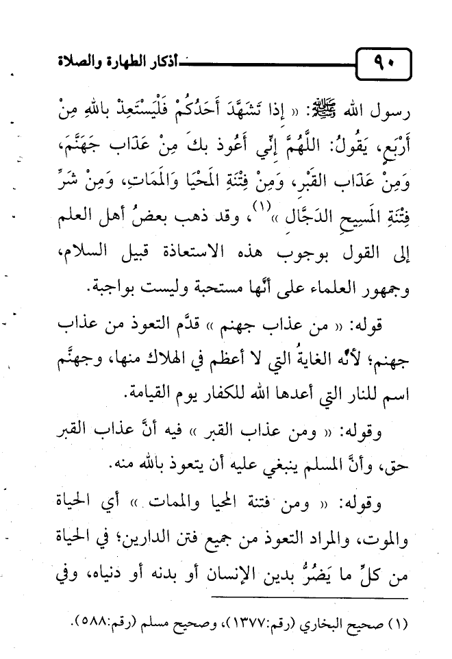 رسول الله صلى الله عليه وسلم: "إِذا تَشَهَّدَ أَحَدُكُمْ فَلْيَسْتَعِذْ باللهِ مِنْ أَرْبَعٍ، يَقُولُ: اللَّهُمَّ إِنِّي أَعُوذ بكَ مِنْ عَذَاب جَهَنَّمَ، وَمِنْ عَذَاب القَبْرِ، وَمِنْ فِتْنَةِ المَحْيَا وَالمَمَاتِ، وَمِنْ شَرِّ فِتْنَةِ المَسِيحِ الدَجَّالِ" 1، وقد ذهب بعضُ أهل العلم إلى القول بوجوب هذه الاستعاذة قبيل السلام، وجمهور العلماء على أنَّها مستحبة وليست بواجبة.