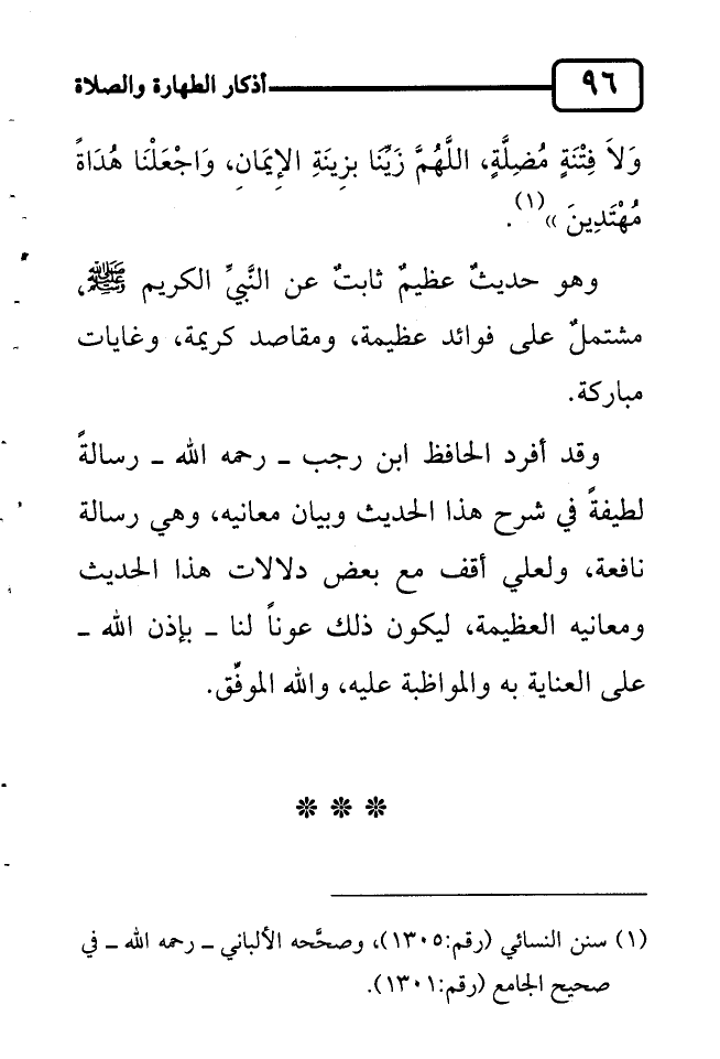 وَلاَ فِتْنَةٍ مُضِلَّةٍ، اللَّهُمَّ زَيِّنَا بزِينَةِ الإِيمَانِ، وَاجْعَلْنَا هُدَاةً مُهْتَدِينَ" 1.