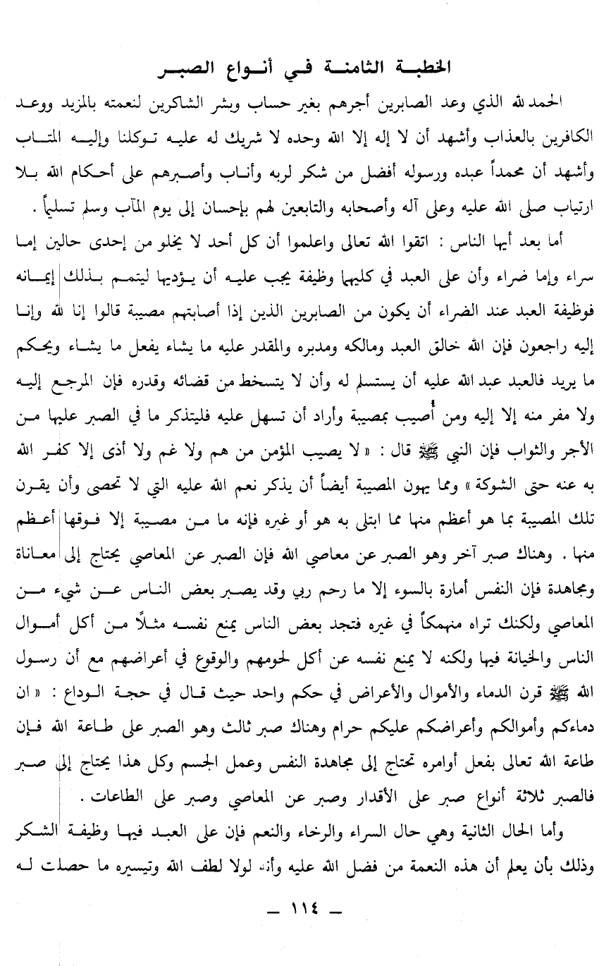 أما بعد أيها الناس: اتقوا الله تعالى، واعلموا أن كل أحد لا يخلو من إحدى حالين إما سراء، وإما ضراء، وأن على العبد في كليهما وظيفة يجب عليه أن يؤديها ليتمم بذلك إيمانه، فوظيفة العبد عن الضراء أن يكون من الصابرين الذين إذا أصابتهم مصيبة قالوا: إنا لله وإنا إليه راجعون، فإن الله خالق العبد، ومالكه، ومدبره، والمقدر عليه ما يشاء يفعل ما يشاء، ويحكم ما يريد، فالعبد عبد الله عليه أن يستسلم له، وأن لا يتسخط من قضائه وقدره، فإن المرجع إليه، ولا مفر منه إلا إليه، ومن أصيب بمصيبة، وأراد أن تسهل عليه، فليتذكر ما في الصبر عليها من الأجر والثواب، فإن النبي صلى الله عليه وسلم قال: «لا يصيب المؤمن من هم، ولا غم، ولا أذى إلا كفر الله به عنه حتى الشوكة» . ومما يهون المصيبة أيضا أن يذكر نعم الله عليه التي لا تحصى، وأن يقرن تلك المصيبة بما هو أعظم منها مما ابتلى به هو أو غيره، فإنه ما من مصيبة إلا فوقها أعظم منها. وهناك صبر آخر وهو الصبر عن معاصي الله، فإن الصبر عن المعاصي يحتاج إلى معاناة ومجاهدة، فإن النفس أمارة بالسوء، إلا ما رحم ربي، وقد يصبر بعض الناس عن شيء من المعاصي، ولكنك تراه منهمكا في غيره، فتجد بعض الناس يمنع نفسه مثلا من أكل أموال الناس والخيانة فيها، ولكنه لا يمنع نفسه عن أكل لحومهم والوقوع في أعراضهم مع أن رسول الله صلى الله عليه وسلم قرن الدماء والأموال والأعراض في حكم واحد حيث قال في حجة الوداع: «إن دماءكم وأموالكم وأعراضكم عليكم حرام، وهناك صبر ثالث، وهو الصبر على طاعة الله، فإن طاعة الله تعالى بفعل أوامره تحتاج إلى مجاهدة النفس، وعمل الجسم، وكل هذا يحتاج إلى صبر، فالصبر ثلاثة أنواع: صبر على الأقدار، وصبر عن المعاصي، وصبر على الطاعات» . وأما الحال الثانية وهي حال السراء والرخاء والنعم، فإن على العبد فيها وظيفة الشكر، وذلك بأن يعلم أن هذه النعمة من فضل الله عليه، وأنه لولا لطف الله وتيسيره ما حصلت له
