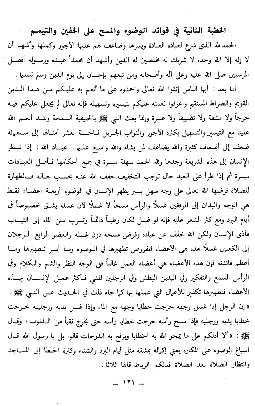 [الخطبة الثانية في فوائد الوضوء والمسح على الخفين والتيمم]