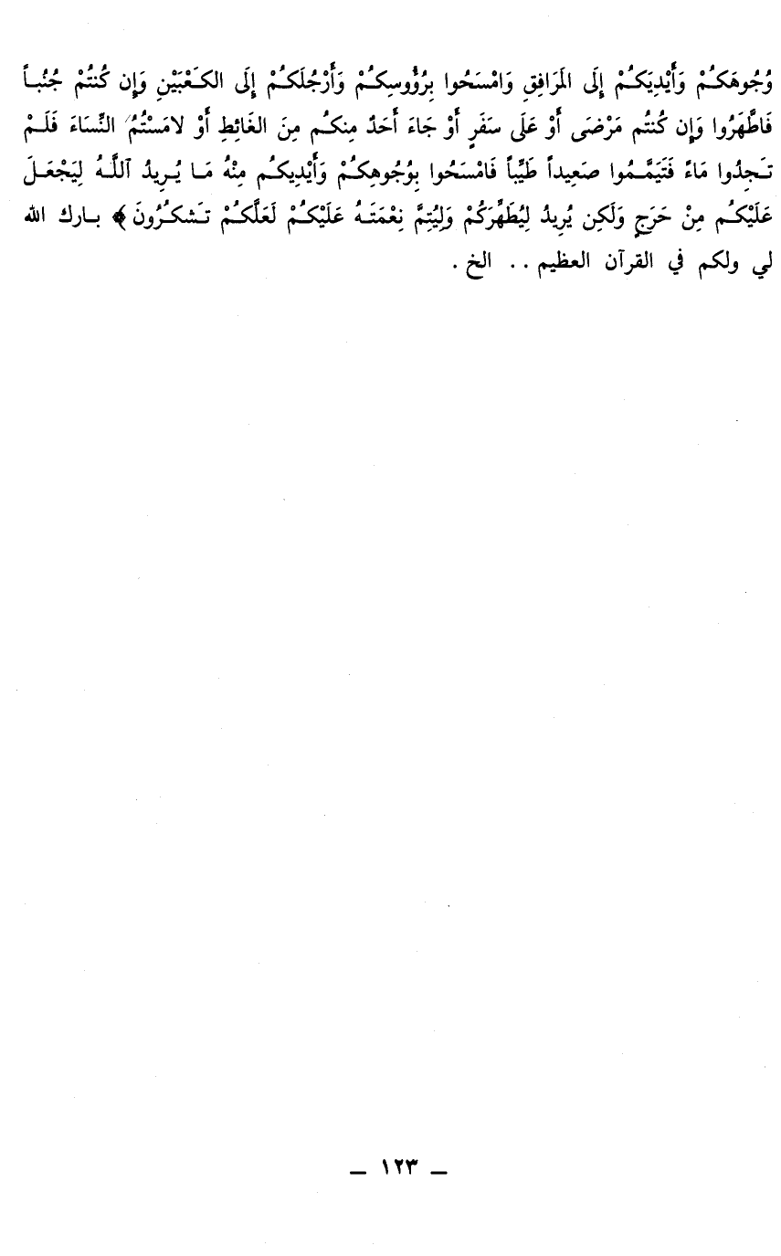 {يَا أَيُّهَا الَّذِينَ آمَنُوا إِذَا قُمْتُمْ إِلَى الصَّلَاةِ فَاغْسِلُوا وُجُوهَكُمْ وَأَيْدِيَكُمْ إِلَى الْمَرَافِقِ وَامْسَحُوا بِرُءُوسِكُمْ وَأَرْجُلَكُمْ إِلَى الْكَعْبَيْنِ وَإِنْ كُنْتُمْ جُنُبًا فَاطَّهَّرُوا وَإِنْ كُنْتُمْ مَرْضَى أَوْ عَلَى سَفَرٍ أَوْ جَاءَ أَحَدٌ مِنْكُمْ مِنَ الْغَائِطِ أَوْ لَامَسْتُمُ النِّسَاءَ فَلَمْ تَجِدُوا مَاءً فَتَيَمَّمُوا صَعِيدًا طَيِّبًا فَامْسَحُوا بِوُجُوهِكُمْ وَأَيْدِيكُمْ مِنْهُ مَا يُرِيدُ اللَّهُ لِيَجْعَلَ عَلَيْكُمْ مِنْ حَرَجٍ وَلَكِنْ يُرِيدُ لِيُطَهِّرَكُمْ وَلِيُتِمَّ نِعْمَتَهُ عَلَيْكُمْ لَعَلَّكُمْ تَشْكُرُونَ} [المائدة: 6] بارك الله لي ولكم في القرآن العظيم. . الخ.