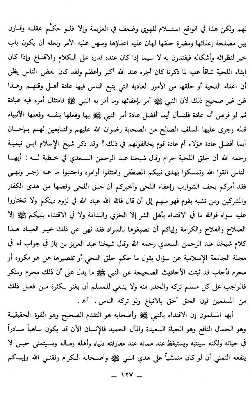 لهم ولكن هذا في الواقع استسلام للهوى وضعف في العزيمة، وإلا فلو حكم عقله، وقارن بين مصلحة إعفائها، ومضرة حلقها لهان عليه إعفاؤها، وسهل عليه الأمر، ولعله أن يكون باب خير لنظرائه وأشكاله، فيقتدون به لا سيما إذا كان عنده قدرة على الكلام والإقناع وإذا كان إبقاء اللحية شاقا عليه لما ذكرناه كان أجره عند الله أكبر وأعظم، ولقد كان بعض الناس يظن أن إعفاء اللحية، أو حلقها من الأمور العادية التي يتبع الناس فيها عادة أهل وقتهم، وهذا ظن غير صحيح، ذلك لأن النبي صلى الله عليه وسلم أمر بإعفائها، وما أمر به النبي صلى الله عليه وسلم فامتثال أمره فيه عبادة، ثم لو فرض أنه عادة، فلنسأل أيما أفضل عادة أمر النبي صلى الله عليه وسلم بها، وفعلها بنفسه، وفعلها الأنبياء قبله، وجرى عليها السلف الصالح من الصحابة رضوان الله عليهم والتابعين لهم بإحسان أيما أفضل عادة هؤلاء أم عادة قوم يخالفونهم في ذلك؟ وقد ذكر شيخ الإسلام ابن تيمية رحمه الله أن حلق اللحية حرام، وقال شيخنا عبد الرحمن السعدي في خطبة له: أيها الناس اتقوا الله، وتمسكوا بهدي نبيكم المصطفى، وامتثلوا أوامره، واجتنبوا ما عنه زجر ونهى، فقد أمركم بحف الشوارب، وإعفاء اللحى، وأخبركم أن حلق اللحى وقصها من هدي الكفار والمشركين، ومن تشبه بقوم فهو منهم إلى أن قال: فالله الله عباد الله في لزوم دينكم، ولا تختاروا عليه سواه، فوالله ما في الاقتداء بأهل الشر إلا الخزي والندامة، ولا في الاقتداء بنبيكم صلى الله عليه وسلم إلا الصلاح والفلاح والكرامة، وإياكم أن تصبغوها بالسواد، فقد نهى عن ذلك خير العباد هذا كلام شيخنا عبد الرحمن السعدي رحمه الله، وقال شيخنا عبد العزيز بن باز في جواب له في مجلة الجامعة الإسلامية عن سؤال يقول: ما حكم حلق اللحى أو تقصيرها هل هو مكروه أو محرم؟ فأجاب قد ثبتت الأحاديث الصحيحة عن النبي صلى الله عليه وسلم ما يدل على أن ذلك محرم ومنكر فالواجب على كل مسلم تركه والحذر منه، ولا ينبغي للمسلم أن يغتر بكثرة من فعل ذلك من المسلمين، فإن الحق أحق بالاتباع، ولو تركه الناس. أهـ.