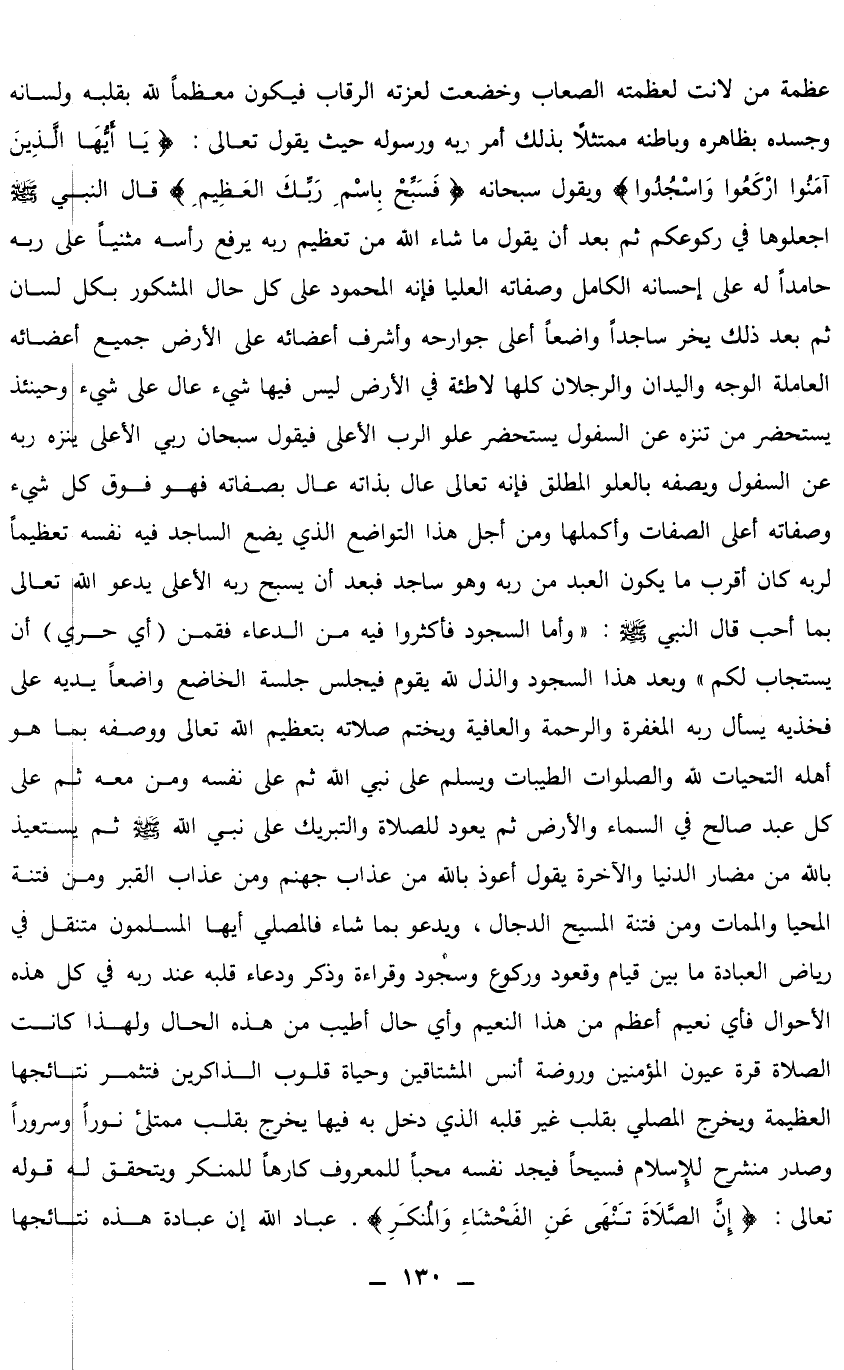 عظمة من لانت لعظمته الصعاب، وخضعت لعزته الرقاب، فيكون معظما لله بقلبه ولسانه وجسده بظاهره وباطنه، ممتثلا بذلك أمر ربه ورسوله حيث يقول تعالى: {يَا أَيُّهَا الَّذِينَ آمَنُوا ارْكَعُوا وَاسْجُدُوا} [الحج: 77] ويقول سبحانه: {فَسَبِّحْ بِاسْمِ رَبِّكَ الْعَظِيمِ} [الواقعة: 74] قال النبي صلى الله عليه وسلم: «اجعلوها في ركوعكم» ، ثم بعد أن يقول ما شاء الله من تعظيم ربه يرفع رأسه مثنيا على ربه حامدا له على إحسانه الكامل، وصفاته العليا، فإنه المحمود على كل حال المشكور بكل لسان، ثم بعد ذلك يخر ساجدا واضعا أعلى جوارحه وأشرف أعضائه على الأرض جميع أعضائه العاملة الوجه واليدان والرجلان كلها لاطئة في الأرض ليس فيها شيء عال على شيء، وحينئذ يستحضر من تنزه عن السفول يستحضر علو الرب الأعلى، فيقول: سبحان ربي الأعلى، ينزه ربه عن السفول، ويصفه بالعلو المطلق، فإنه تعالى عال بذاته، عال بصفاته، فهو فوق كل شيء، وصفاته أعلى الصفات، وأكملها ومن أجل هذا التواضع الذي يضع الساجد فيه نفسه تعظيما لربه كان أقرب ما يكون العبد من ربه وهو ساجد، فبعد أن يسبح ربه الأعلى يدعو الله تعالى بما أحب، قال النبي صلى الله عليه وسلم: «وأما السجود فأكثروا فيه من الدعاء فقمن -أي حري- أن يستجاب لكم» . وبعد هذا السجود، والذل لله يقوم، فيجلس جلسة الخاضع واضعا يديه على فخذيه يسأل ربه المغفرة والرحمة والعافية، ويختم صلاته بتعظيم الله تعالى ووصفه بما هو أهله التحيات لله، الصلوات، الطيبات، ويسلم على نبي الله، ثم على نفسه، ومن معه، ثم على كل عبد صالح في السماء والأرض، ثم يعود للصلاة والتبريك على نبي الله صلى الله عليه وسلم، ثم يستعيذ بالله من مضار الدنيا والآخرة يقول: أعوذ بالله من عذاب جهنم، ومن عذاب القبر، ومن فتنة المحيا والممات، ومن فتنة المسيح الدجال، ويدعو بما شاء، فالمصلي أيها المسلمون متنقل في رياض العبادة ما بين قيام، وقعود، وركوع، وسجود، وقراءة، وذكر، ودعاء قلبه عند ربه في كل هذه الأحوال، فأي نعيم أعظم من هذا النعيم، وأي حال أطيب من هذه الحال؟ ولهذا كانت الصلاة قرة عيون المؤمنين، وروضة أنس المشتاقين، وحياة قلوب الذاكرين، فتثمر نتائجها العظيمة، ويخرج المصلي بقلب غير قلبه الذي دخل به فيها يخرج بقلب ممتلئ نورا وسرورا وصدر منشرح للإسلام فسيحا، فيجد نفسه محبا للمعروف كارها للمنكر، ويتحقق له قوله تعالى: {إِنَّ الصَّلَاةَ تَنْهَى عَنِ الْفَحْشَاءِ وَالْمُنْكَرِ} [العنكبوت: 45] عباد الله إن عبادة هذه نتائجها