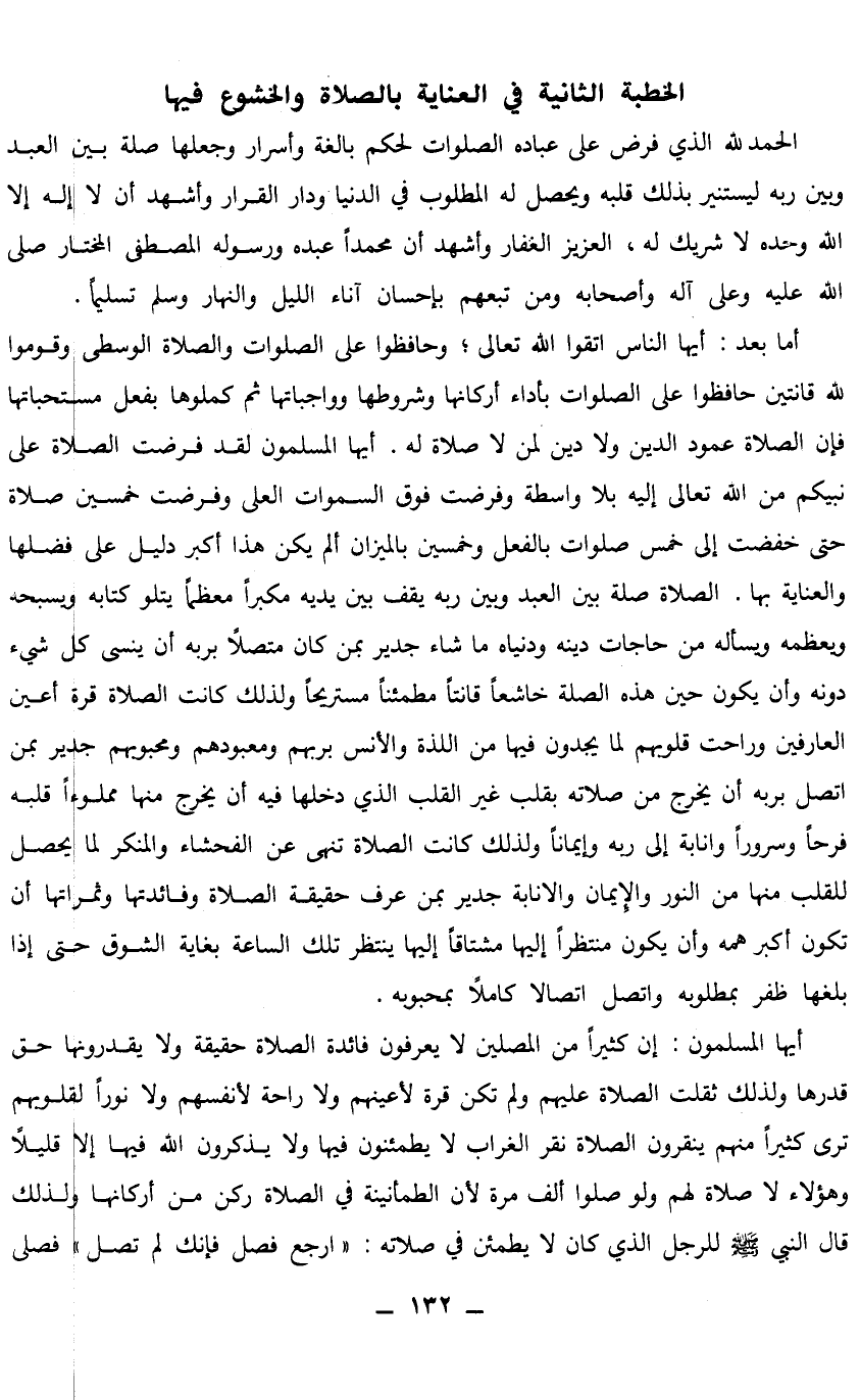 في العناية بالصلاة والخشوع فيها الحمد لله الذي فرض على عباده الصلوات لحكم بالغة وأسرار، وجعلها صلة بين العبد وبين ربه ليستنير بذلك قلبه، ويحصل له المطلوب في الدنيا ودار القرار، وأشهد أن لا إله إلا الله وحده لا شريك له، العزيز الغفار، وأشهد أن محمدا عبده ورسوله المصطفى المختار صلى الله عليه وعلى آله وأصحابه ومن تبعهم بإحسان آناء الليل والنهار، وسلم تسليما.