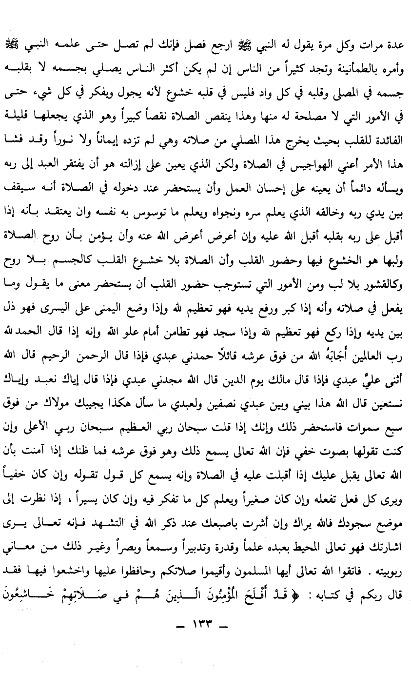 عدة مرات، وكل مرة يقول له النبي صلى الله عليه وسلم: ارجع فصل، فإنك لم تصل، حتى علمه النبي صلى الله عليه وسلم، وأمره بالطمأنينة» ، وتجد كثيرا من الناس إن لم يكن أكثر الناس يصلي بجسمه لا بقلبه جسمه في المصلى، وقلبه في كل واد، فليس في قلبه خشوع؛ لأنه يجول، ويفكر في كل شيء، حتى في الأمور التي لا مصلحة له منها، وهذا ينقص الصلاة نقصا كبيرا، وهو الذي يجعلها قليلة الفائدة للقلب بحيث يخرج هذا المصلي من صلاته، وهي لم تزده إيمانا ولا نورا، وقد فشا هذا الأمر أعني الهواجيس في الصلاة، ولكن الذي يعين على إزالته هو أن يفتقر العبد إلى ربه، ويسأله دائما أن يعينه على إحسان العمل، وأن يستحضر عند دخوله في الصلاة أنه سيقف بين يدي ربه وخالقه الذي يعلم سره ونجواه، ويعلم ما توسوس به نفسه، وأن يعتقد بأنه إذا أقبل على ربه بقلبه أقبل الله عليه، وإن أعرض أعرض الله عنه، وأن يؤمن بأن روح الصلاة ولبها هو الخشوع فيها وحضور القلب، وأن الصلاة بلا خشوع القلب كالجسم بلا روح، وكالقشور بلا لب، ومن الأمور التي تستوجب حضور القلب أن يستحضر معنى ما يقول، وما يفعل في صلاته، وأنه إذا كبر، ورفع يديه، فهو تعظيم لله، وإذا وضع اليمنى على اليسرى، فهو ذل بين يديه، وإذا ركع، فهو تعظيم لله، وإذا سجد، فهو تطامن أمام علو الله، وأنه إذا قال: {الْحَمْدُ لِلَّهِ رَبِّ الْعَالَمِينَ} [الفاتحة: 2] أجابه الله من فوق عرشه قائلا: حمدني عبدي، فإذا قال: {الرَّحْمَنِ الرَّحِيمِ} [الفاتحة: 1] قال الله: أثنى علي عبدي، فإذا قال: {مَالِكِ يَوْمِ الدِّينِ} [الفاتحة: 4] قال الله: مجدني عبدي، فإذا قال: {إِيَّاكَ نَعْبُدُ وَإِيَّاكَ نَسْتَعِينُ} [الفاتحة: 5] قال الله: هذا بيني وبين عبدي نصفين، ولعبدي ما سأل، هكذا يجيبك مولاك من فوق سبع سموات، فاستحضر ذلك، وإنك إذا قلت: سبحان ربي العظيم، سبحان ربي الأعلى، وإن كنت تقولها بصوت خفي، فإن الله تعالى يسمع ذلك، وهو فوق عرشه، فما ظنك إذ آمنت بأن الله تعالى يقبل عليك إذا أقبلت عليه في الصلاة، وإنه يسمع كل قول تقوله، وإن كان خفيا، ويرى كل فعل تفعله، وإن كان صغيرا، ويعلم كل ما تفكر فيه، وإن كان يسيرا، إذا نظرت إلى موضع سجودك، فالله يراك، وإن أشرت بأصبعك عند ذكر الله في التشهد، فإنه تعالى يرى إشارتك، فهو تعالى المحيط بعبده علما وقدرة وتدبيرا وسمعا وبصرا، وغير ذلك من معاني ربوبيته. فاتقوا الله تعالى، أيها المسلمون، وأقيموا صلاتكم، وحافظوا عليها، واخشعوا فيها، فقد قال ربكم في كتابه: {قَدْ أَفْلَحَ الْمُؤْمِنُونَ - الَّذِينَ هُمْ فِي صَلَاتِهِمْ خَاشِعُونَ} [المؤمنون: 1 - 2]