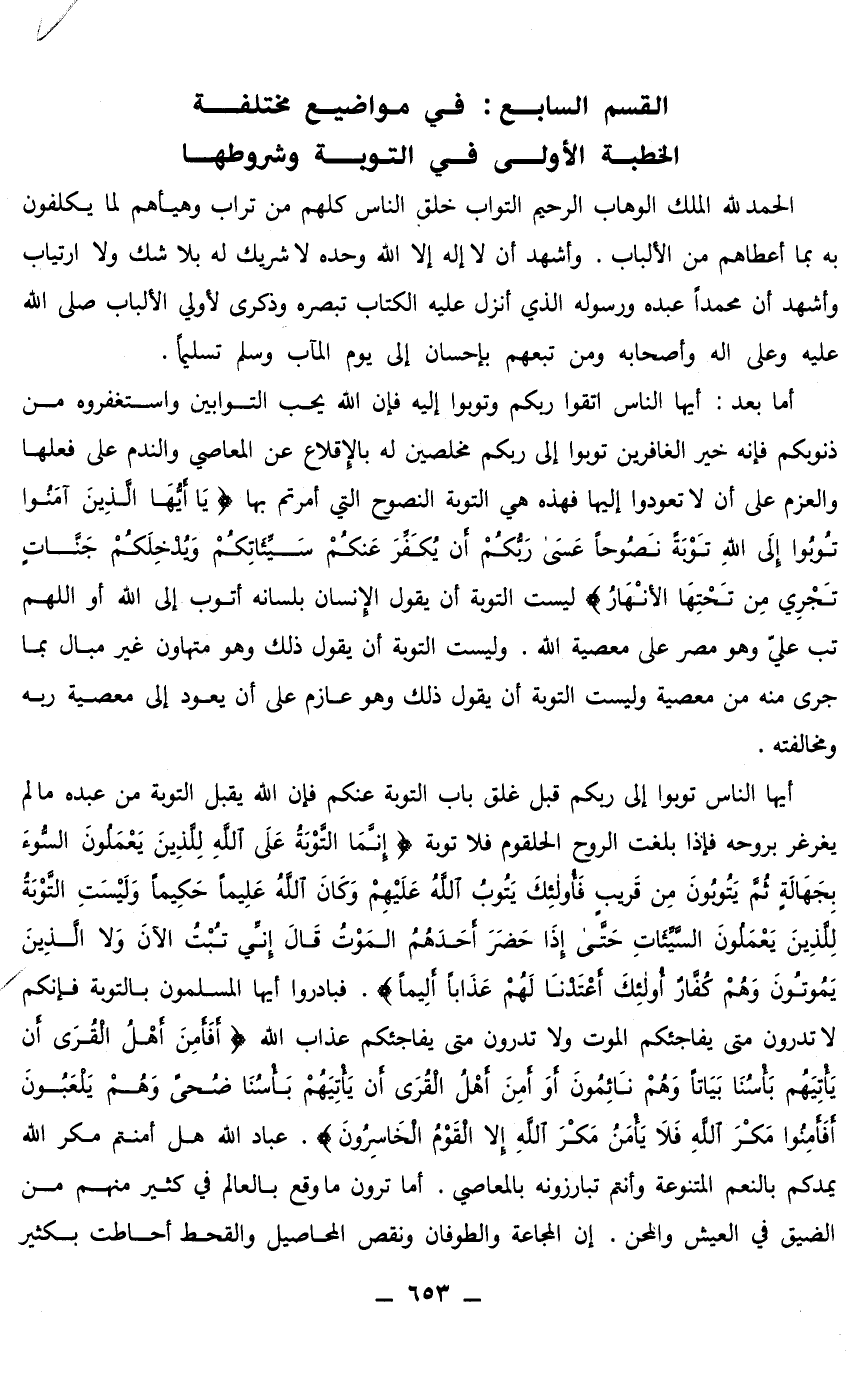 في التوبة وشروطها الحمد لله الملك الوهاب الرحيم التواب خلق الناس كلهم من تراب وهيأهم لما يكلفون به مما أعطاهم من الألباب. وأشهد أن لا إله إلا الله وحده لا شريك له بلا شك ولا ارتياب وأشهد أن محمدا عبده ورسوله الذي أنزل عليه الكتاب تبصرة وذكرى لأولي الألباب صلى الله عليه وعلى آله وأصحابه ومن تبعهم بإحسان إلى يوم المآب وسلم تسليما.