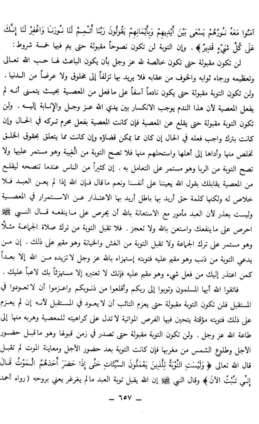 فاتقوا الله أيها المسلمون وتوبوا إلى ربكم وأقلعوا من ذنوبكم واعزموا أن لا تعودوا في المستقبل فلن تكون التوبة مقبولة حتى يعزم التائب أن لا يعود في المستقبل لأنه لم يعزم على ذلك فتوبته مؤقتة يتحين فيها الفرص المواتية لا تدل على كراهيته للمعصية وهربه منها إلى طاعة الله عز وجل. وأن تكون التوبة مقبولة حتى تصدر في زمن قبولها وهو ما قبل حضور الأجل وطلوع الشمس من مغربها فإن كانت التوبة بعد حضور الأجل ومعاينة الموت لم تقبل قال الله تعالى: {وَلَيْسَتِ التَّوْبَةُ لِلَّذِينَ يَعْمَلُونَ السَّيِّئَاتِ حَتَّى إِذَا حَضَرَ أَحَدَهُمُ الْمَوْتُ قَالَ إِنِّي تُبْتُ الْآنَ} [النساء: 18] وقال النبي صلى الله عليه وسلم: «إن الله يقبل توبة العبد ما لم يغرغر يعني بروحه» (رواه أحمد