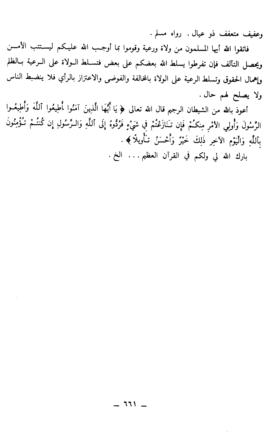 فاتقوا الله أيها المسلمون من ولاة ورعية وقوموا بما أوجب الله عليكم ليستتب الأمن ويحصل التآلف فإن تفرطوا يسلط الله بعضكم على بعض فتسلط الولاة على الرعية بالظلم وإهمال الحقوق وتسلط الرعية على الولاة بالمخالفة والفوضى والاعتزاز بالرأي فلا ينضبط الناس ولا يصلح لهم حال.
