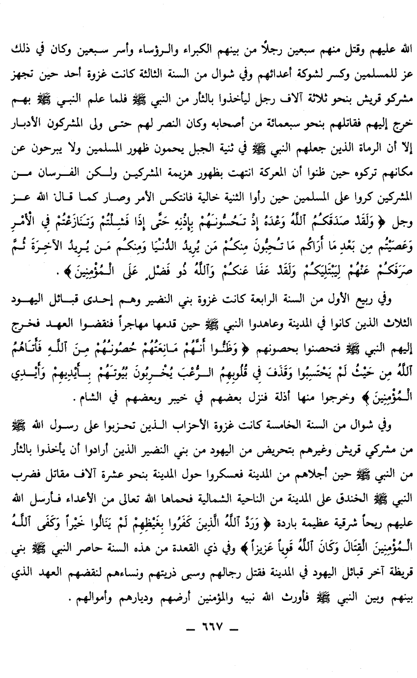 الله عليهم وقتل منهم سبعين رجلا من بينهم الكبراء والرؤساء وأسر سبعين وكان في ذلك مشركو قريش بنحو ثلاثة آلاف رجل ليأخذوا بالثأر من النبي صلى الله عليه وسلم فلما علم النبي صلى الله عليه وسلم بهم خرج إليهم فقاتلهم بنحو سبعمائة من أصحاب وكان النصر لهم حتى ولى المشركون الأدبار إلا أن الرماة الذين جعلهم النبي صلى الله عليه وسلم في ثنية الجبل يحمون ظهور المسلمين ولا يبرحون عن مكانهم تركوه حين ظنوا أن المعركة انتهت بظهور هزيمة المشركين ولكن الفرسان من المشركين كروا على المسلمين حين رأوا الثنية خالية فانتكس الأمر وصار كما قال الله عز وجل: {وَلَقَدْ صَدَقَكُمُ اللَّهُ وَعْدَهُ إِذْ تَحُسُّونَهُمْ بِإِذْنِهِ حَتَّى إِذَا فَشِلْتُمْ وَتَنَازَعْتُمْ فِي الْأَمْرِ وَعَصَيْتُمْ مِنْ بَعْدِ مَا أَرَاكُمْ مَا تُحِبُّونَ مِنْكُمْ مَنْ يُرِيدُ الدُّنْيَا وَمِنْكُمْ مَنْ يُرِيدُ الْآخِرَةَ ثُمَّ صَرَفَكُمْ عَنْهُمْ لِيَبْتَلِيَكُمْ وَلَقَدْ عَفَا عَنْكُمْ وَاللَّهُ ذُو فَضْلٍ عَلَى الْمُؤْمِنِينَ} [آل عمران: 152]