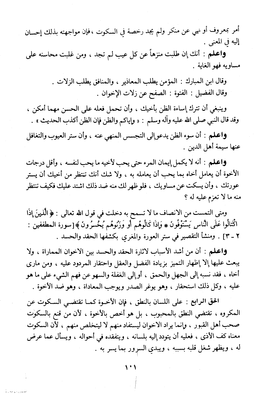 واعلم: أنه لا يكمل إيمان المرء حتى يحب لأخيه ما يحب لنفسه، وأقل درجات الأخوة أن يعامل أخاه بما يحب أن يعامله به، ولا شك أنك تنتظر من أخيك أن يستر عورتك، وأن يسكت عن مساويك، فلو ظهر لك منه ضد ذلك اشتد عليك فكيف تنتظر منه مالا تعزم عليه له؟