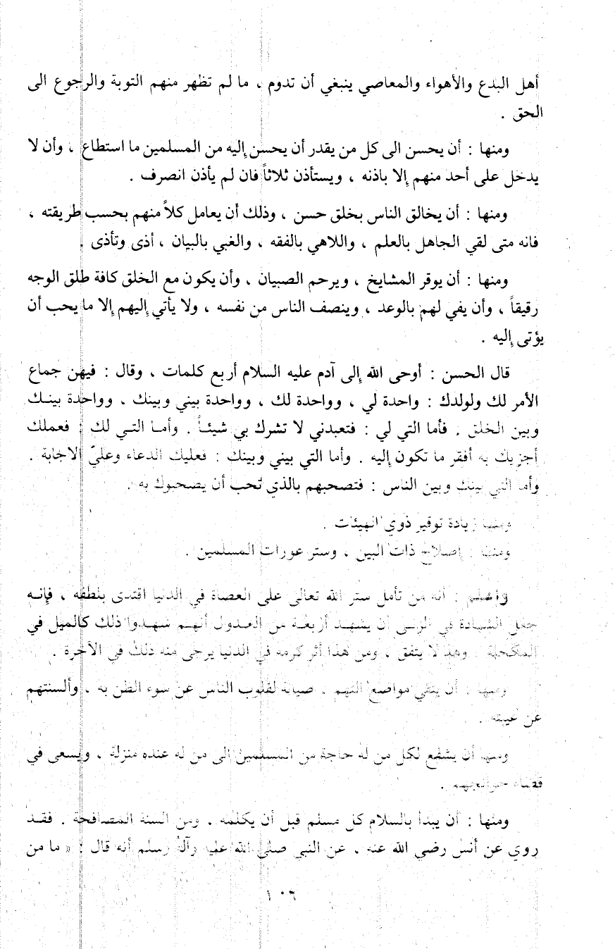 ومنها: أن يخالق الناس بخلق حسن، وذلك أن يعامل كلاً منهم بحسب طريقته، فإنه متى لقى الجاهل بالعلم، واللاهى بالفقه، والغبى بالبيان، أذى وتأذى.