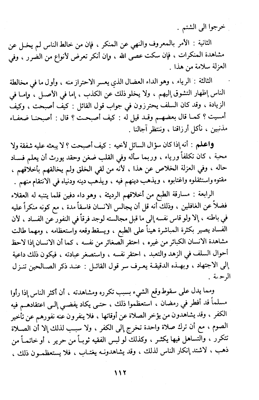 الثانية: الأمر بالمعروف والنهى عن المنكر، فإن من خالط الناس لم يخل ع مشاهدة المنكرات، فإن سكت عصى الله، وإن أنكر تعرض لأنواع من الضرر، في العزلة سلامة من هذا.