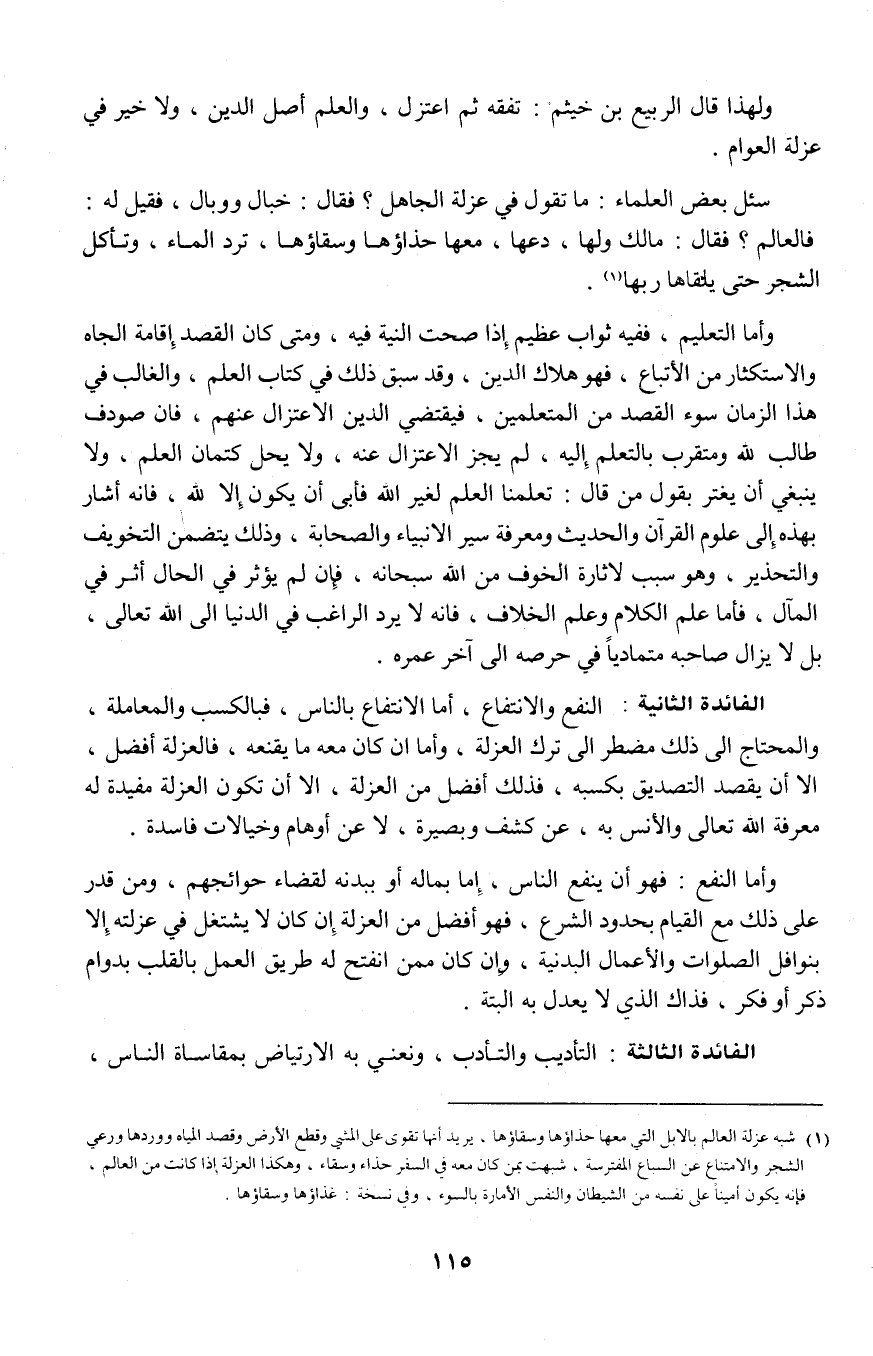 ولهذا قال الربيع بن خثيم: تفقه ثم اعتزل، والعلم أصل الدين، ولا خير في عزلة العوام.