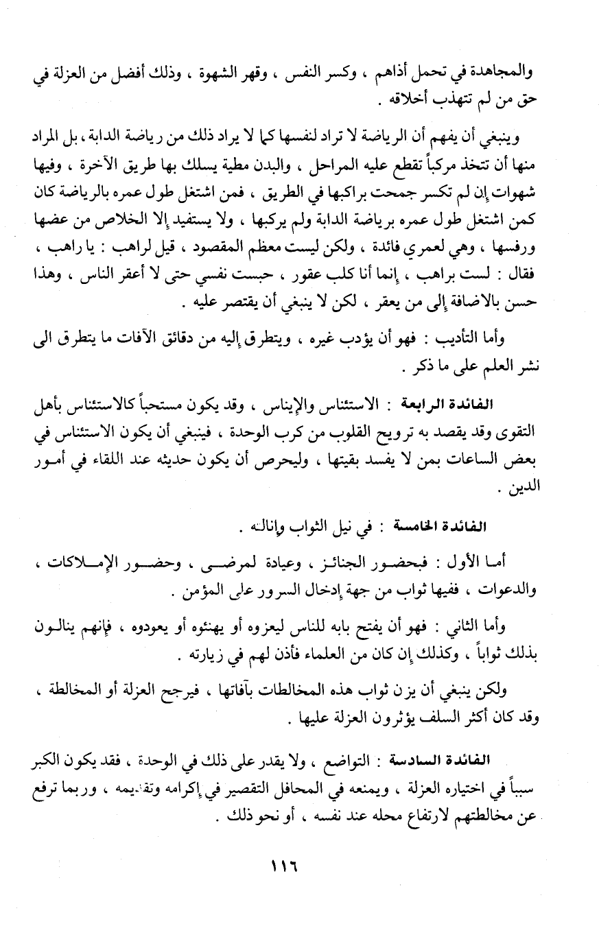 الفائدة السادسة: التواضع، ولا يقدر على ذلك في الوحدة، فقد يكون الكبر سبباً في اختياره العزلة، ويمنعه في المحافل التقصير في إكرامه وتقديمه، وربما ترفع عن مخالطتهم لارتفاع محله عند نفسه، أو نحو ذلك.