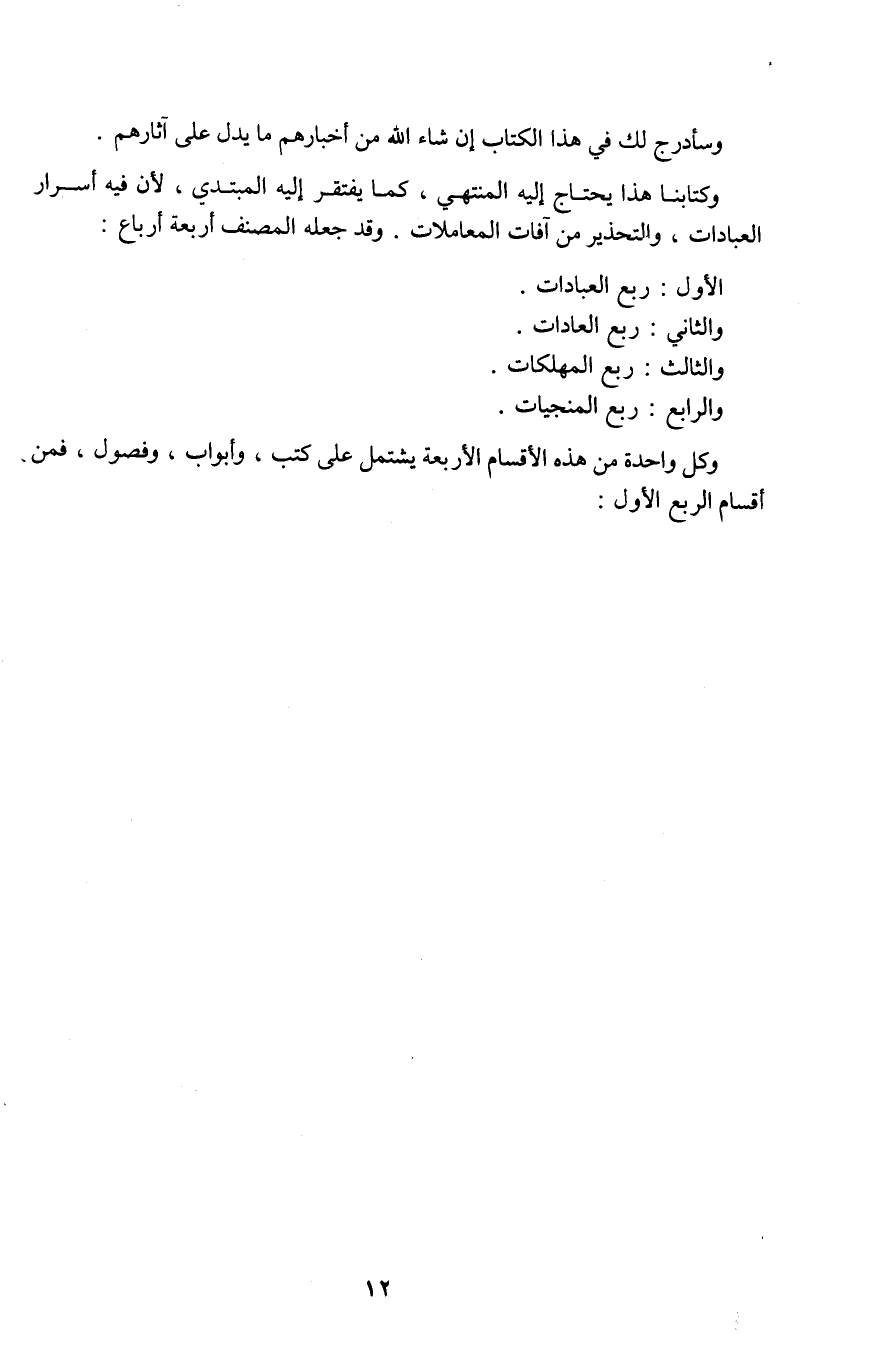 وكتابنا هذا يحتاج إليه المنتهي، كما يفتقر إليه المبتدي، لأن فيه أسرار العبادات، والتحذير من آفات المعاملات. وقد جعله المصنف أربعة أرباع: