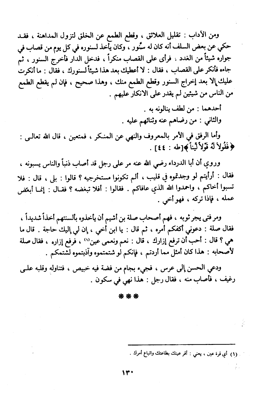 ومن الآداب: تقليل العلائق، وقطع الطمع عن الخلق لتزول المداهنة، فقد حكى عن بعض السلف أنه كان له سنور، وكان يأخذ لسنوره في كل يوم من قصاب في جواره شيئاً من الغدد. فرأى على القصاب منكراً، فدخل الدار فأخرج السنور، ثم جاءه فأنكر على القصاب، فقال: لا أعطيك بعد هذا شيئاً لسنورك، فقال: ما أنكرت عليك إلا بعد إخراج السنور وقطع الطمع منك، وهذا صحيح، فإن لم يقطع الطمع من الناس من شيئين لم يقدر على الإنكار عليهم.