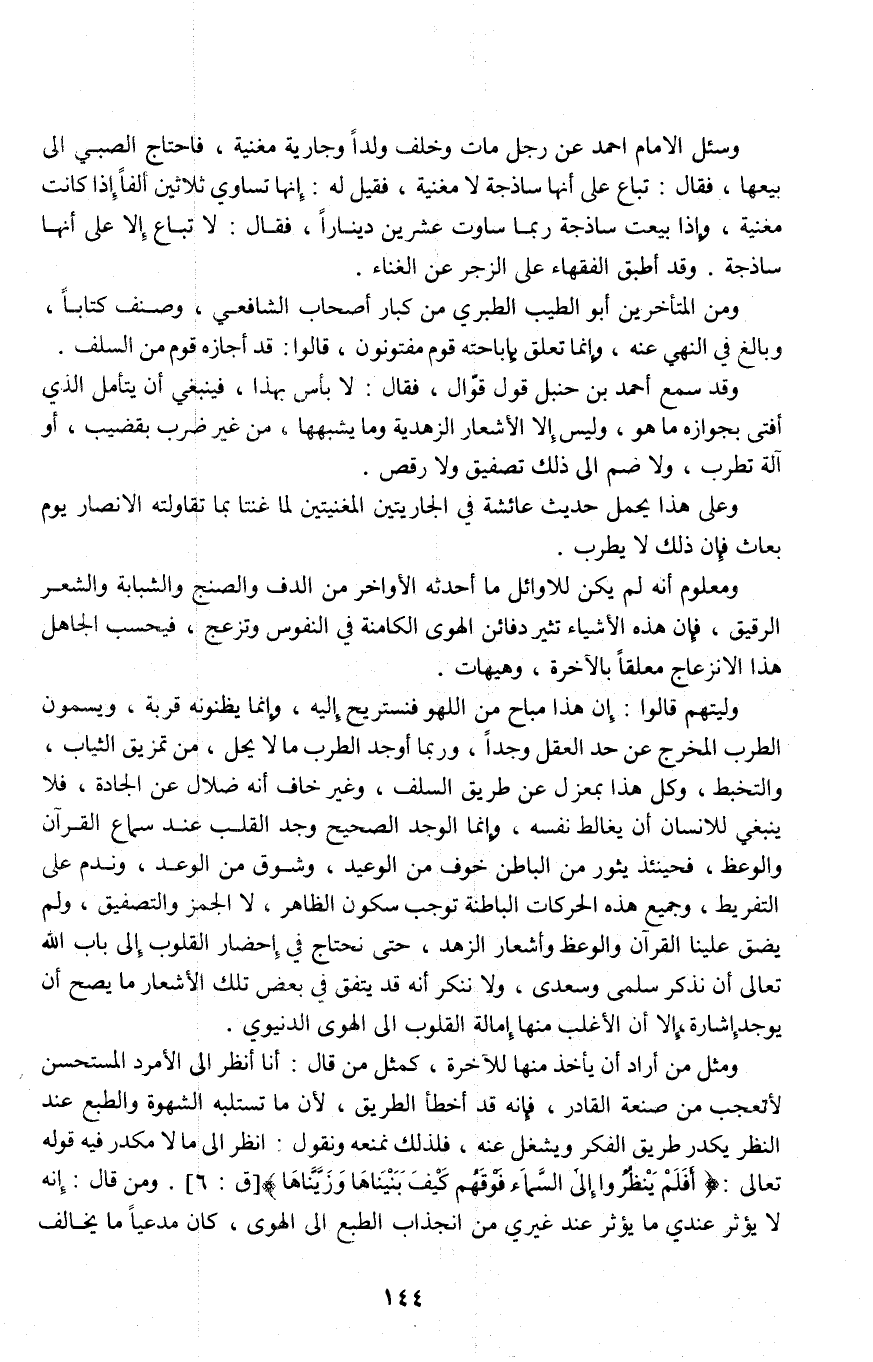 ومن المتأخرين أبو الطيب الطبرى من كبار أصحاب الشافعى، وصنف كتاباً، وبالغ في النهى عنه، وإنما تعلق بإباحته قوم مفتونون، قالوا: قد أجازه قوم من السلف. وقد سمع أحمد بن حنبل قول قوال، فقال: لا بأس بهذا، فينبغى أن يتأمل الذي أفتى بجوازه ماهو، وليس إلا الأشعار الزهدية وما يشبهها، من غير ضرب بقضيب، أو آلة تطرب، ولا ضم إلى ذلك تصفيق ولا رقص.