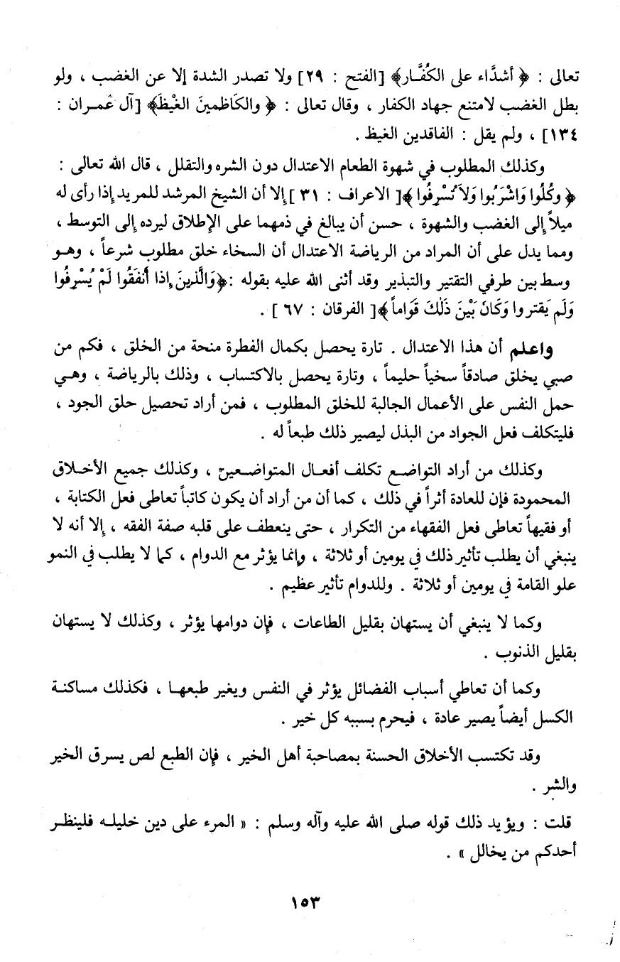 وكذلك المطلوب في شهوة الطعام الاعتدال دون الشره والتقلل: قال الله تعالى: {وَكُلُوا وَاشْرَبُوا وَلَا تُسْرِفُوا} [الأعراف: 31] إلا أن الشيخ المرشد للمريد إذا رأى له ميلاً إلى الغضب أو الشهوة، حسن أن يبالغ في ذمها على الطلاق ليرده إلى التوسط، ومما يدل على أن المراد من الرياضة الاعتدال أن السخاء خلق مطلوب شرعاً وهو وسط بين طرفي التقتير والتبذير وقد أثنى الله عليه بقوله: {وَالَّذِينَ إِذَا أَنْفَقُوا لَمْ يُسْرِفُوا وَلَمْ يَقْتُرُوا وَكَانَ بَيْنَ ذَلِكَ قَوَامًا} [الفرقان: 67].