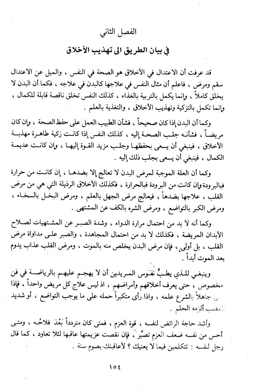 وكما أن البدن إذا كان صحيحاً، فشأن الطبيب العمل على حفظ الصحة، وإن كان مريضاً، فشأنه جلب الصحة إليه، كذلك النفس إذا كانت زكية طاهرة مهذبة الخلاق، فينبغي أن يسعى بحفظها وجلب مزيد القوة إليها، وإن كانت عديمة الكمال، فينبغي أن يسعى بجلب ذلك إليه.