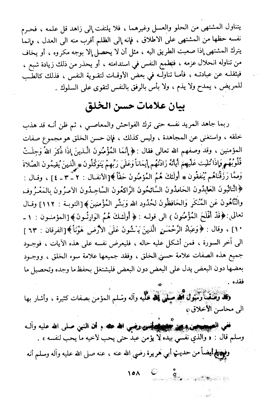 ربما جاهد المريد نفسه حتى ترك الفواحش والمعاصي، ثم ظن أنه قد هذب خلقه، واستغنى عن المجاهدة، وليس كذلك، فإن حسن الخلق هو مجموع صفات المؤمنين، وقد وصفهم الله تعالى فقال: {إِنَّمَا الْمُؤْمِنُونَ الَّذِينَ إِذَا ذُكِرَ اللَّهُ وَجِلَتْ قُلُوبُهُمْ وَإِذَا تُلِيَتْ عَلَيْهِمْ آيَاتُهُ زَادَتْهُمْ إِيمَانًا وَعَلَى رَبِّهِمْ يَتَوَكَّلُونَ (2) الَّذِينَ يُقِيمُونَ الصَّلَاةَ وَمِمَّا رَزَقْنَاهُمْ يُنْفِقُونَ (3) أُولَئِكَ هُمُ الْمُؤْمِنُونَ حَقًّا} [الأنفال: 2 - 4] وقال: {التَّائِبُونَ الْعَابِدُونَ الْحَامِدُونَ السَّائِحُونَ الرَّاكِعُونَ السَّاجِدُونَ الْآمِرُونَ بِالْمَعْرُوفِ وَالنَّاهُونَ عَنِ الْمُنْكَرِ وَالْحَافِظُونَ لِحُدُودِ اللَّهِ وَبَشِّرِ الْمُؤْمِنِينَ} [التوبة: 112] وقال تعالى: {قَدْ أَفْلَحَ الْمُؤْمِنُونَ} إلى قوله {أُولَئِكَ هُمُ الْوَارِثُونَ} [المؤمنون: 1 - 10]، وقال: {وَعِبَادُ الرَّحْمَنِ الَّذِينَ يَمْشُونَ عَلَى الْأَرْضِ هَوْنًا} [الفرقان: 63] إلى آخر السورة، فمن أشكل عليه حاله فليعرض نفسه على هذه الآيات، فوجود جميع هذه الصفات علامة حسن الخلق، وفقد جميعها علامة سوء الخلق ووجود بعضها دون البعض يدل على البعض دون البعض فليشتغل بحفظ ما وجده وتحصيل ما فقده.
