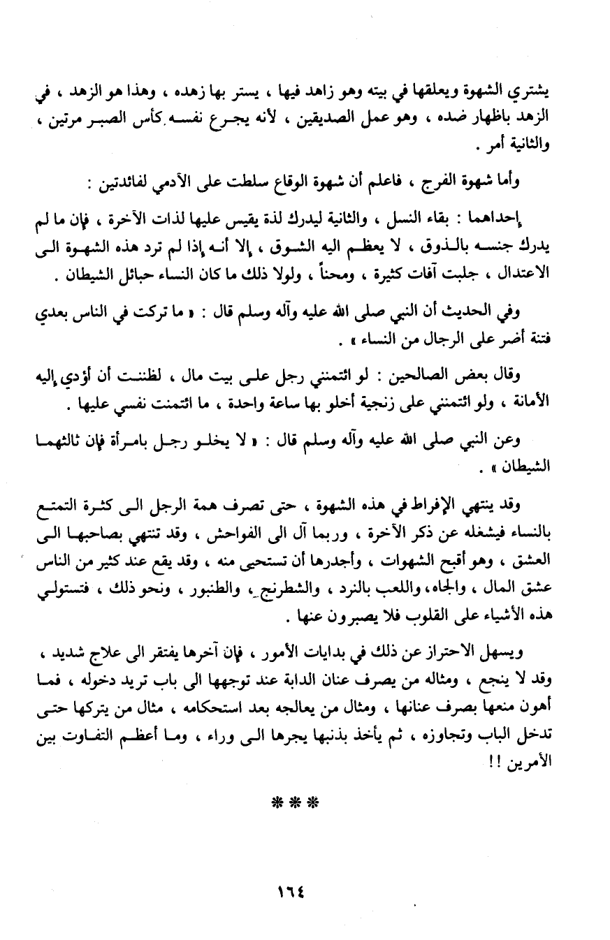 إحداهما: بقاء النسل، والثانية ليدرج لذة يقيس عليها لذات الآخرة، فإن ما لم يدرك جنسه بالذوق، لا يعظم إليه الشوق، إلا أنه إذ لم ترد هذه الشهوة إلى الاعتدال، جلبت آفات كثيرة، ومحناً، ولولا ذلك ما كان النساء حبائل الشيطان.