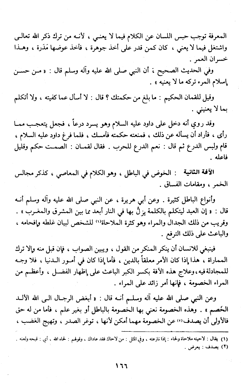 وأنواع الباطل كثيرة. وعن أبى هريرة، عن النبي صلى الله عليه وآله وسلم قال: " إن العبد ليتكلم بالكلمة يزل بها في النار أبعد مما بين المشرق والمغرب،. وقريب من ذلك الجدال والمراء وهو كثرة الملاحاة (¬1) للشخص لبيان غلطة وإفحامه، والباعث على ذلك الترفع.