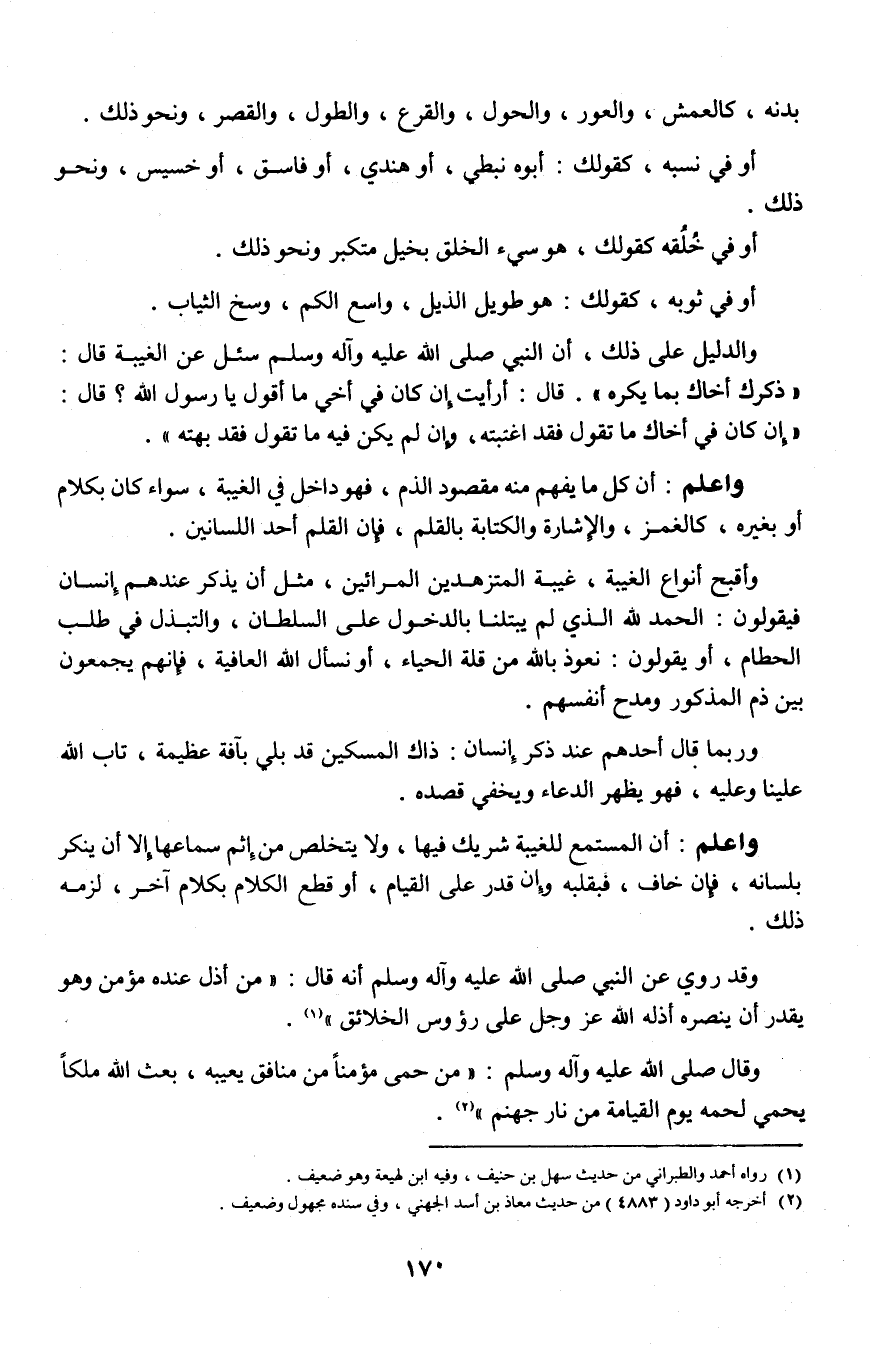 والدليل على ذلك، أن النبي صلى الله عليه وآله وسلم سئل عن الغيبة قال: "ذكرك أخاك بما يكره". قال: أرأيت إن كان في أخي ما أقول يا رسول الله؟ قال: "إن كان في أخاك ما تقول فقد اغتبته، وإن لم يكن فيه ما تقول فقد بهته".