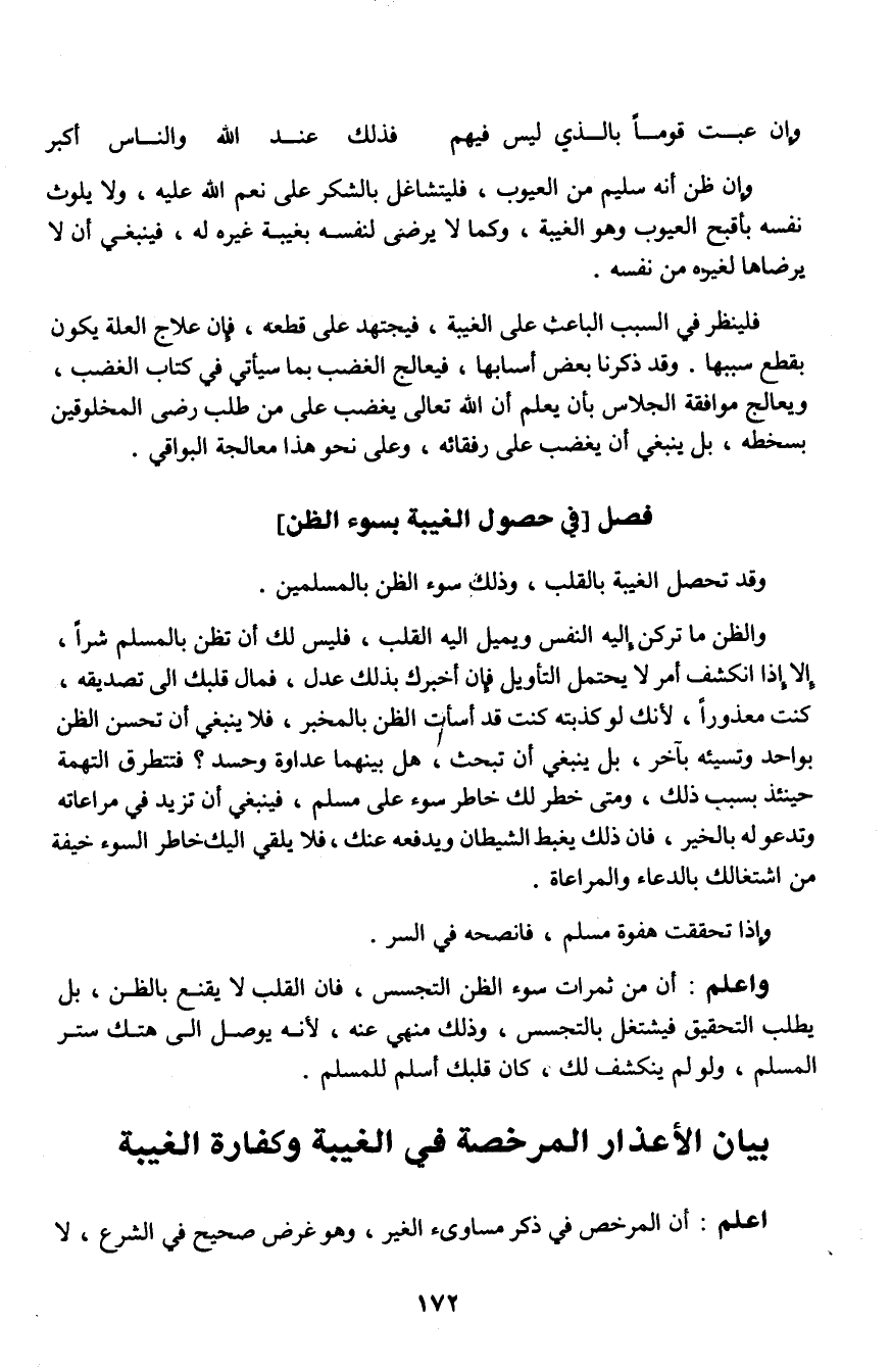 وإن ظن أنه سليم من العيوب، فليتشاغل بالشكر على نعم الله عليه، ولا يلوث نفسه بأقبح العيوب وهو الغيبة، وكما لا يرضى لنفسه بغيبة غيره له، فينبغي أن لا يرضاها لغيره من نفسه.