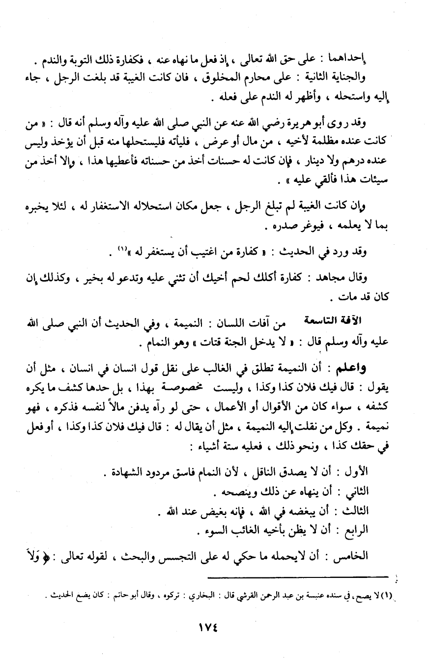 واعلم: أن النميمة تطلق في الغالب على نقل قول إنسان في إنسان، مثل أن يقول: قال فيك فلان كذا وكذا، وليست مخصوصة بهذا، بل حدها كشف ما يكره كشفه، سواء كان من الأقوال أو الأعمال، حتى لو رآه يدفن مالاً لنفسه فذكره فهو نميمة وكل من نقلت إليه النميمة، مثل أن يقال له: قال فيك فلان كذا وكذا أو فعل في حقك كذا، ونحو ذلك فعليه ستة أشياء: