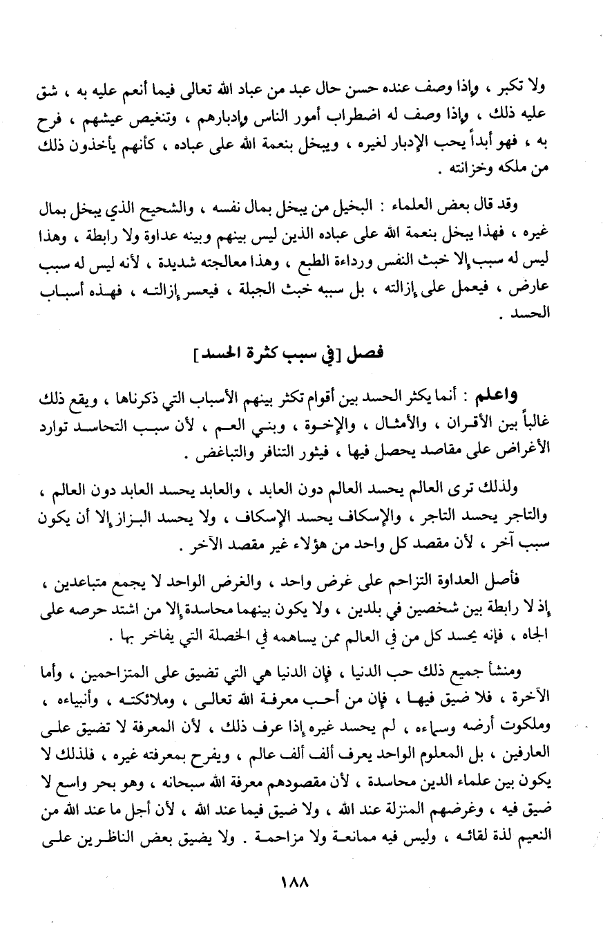 ولذلك ترى العالم يحسد العالم دون العابد، والعابد يحسد العابد دون العالم، والتاجر يحسد التاجر، والإسكاف يحسد الإسكاف، ولا يحسد البزاز إلا أن يكون سبب آخر، لأن مقصد كل واحد من هؤلاء غير مقصد الآخر.