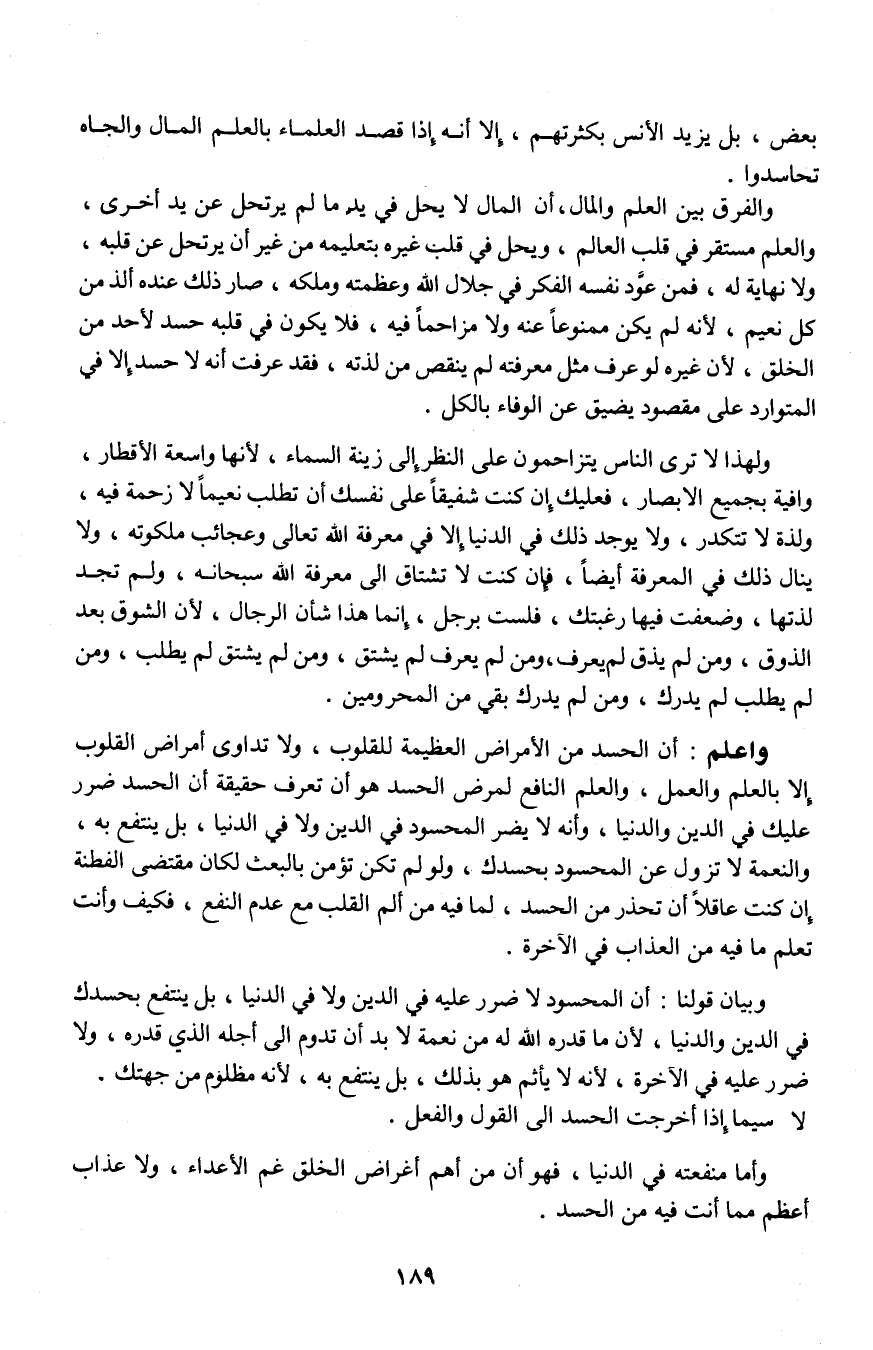 والفرق بين العلم والمال، أن المال لا يحل في يد ما لم يرتحل عن يد أخرى، والعلم مستقر في قلب العلم، ويحل في قلب غيره بتعليمه من غير أن يرتحل عن قلبه، ولا نهاية له، فمن عود نفسه الفكر في جلال الله وعظمته وملكه، وصار ذلك عنده ألذ من كل نعيم، لأنه لم يكن ممنوعاً عنه ولا مزاحماً فيه، فلا يكون في قلبه حسد لأحد من الخلق، لأن غيره لو عرف مثل معرفته لم ينقص من لذته، فقد عرفت أنه لا حسد إلا في المتوارد على مقصود يضيق عن الوفاء بالكل.