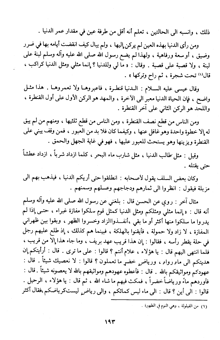 مثال آخر: روى عن الحسن قال: بلغني عن رسول الله صلى الله عليه وآله وسلم أنه قال: "إنما مثلى ومثلكم ومثل الدنيا كمثل قوم سلكوا مفازة غبراء، حتى إذ لم يدوروا ما سلكوا منها اكثر ما بقى، أنفذوا الزاد واخسروا الظهر، وابقوا بين ظاهراني المفازة، لا زاد ولا حمولة، فأيقنوا بالهلكة، فبينما هم كذلك، إذ طلع عليهم رجل في حلة يقطر رأسه، فقالوا: إن هذا قريب عهد بريف، وما جاء هذا إلا من قريب، فلما انتهى إليهم قال: يا هؤلاء، علام أنتم؟ قالوا: على ما ترى. قال: عهودكم ومواثيقكم بالله. قال: فأعطوه عهودهم ومواثيقهم بالله، ثم قال: يا هؤلاء، الرحيل. قالوا: إلى أين؟ قال: إلى ماء ليس كمائكم، وإلى رياض ليست كرياضكم، فقال أكثر