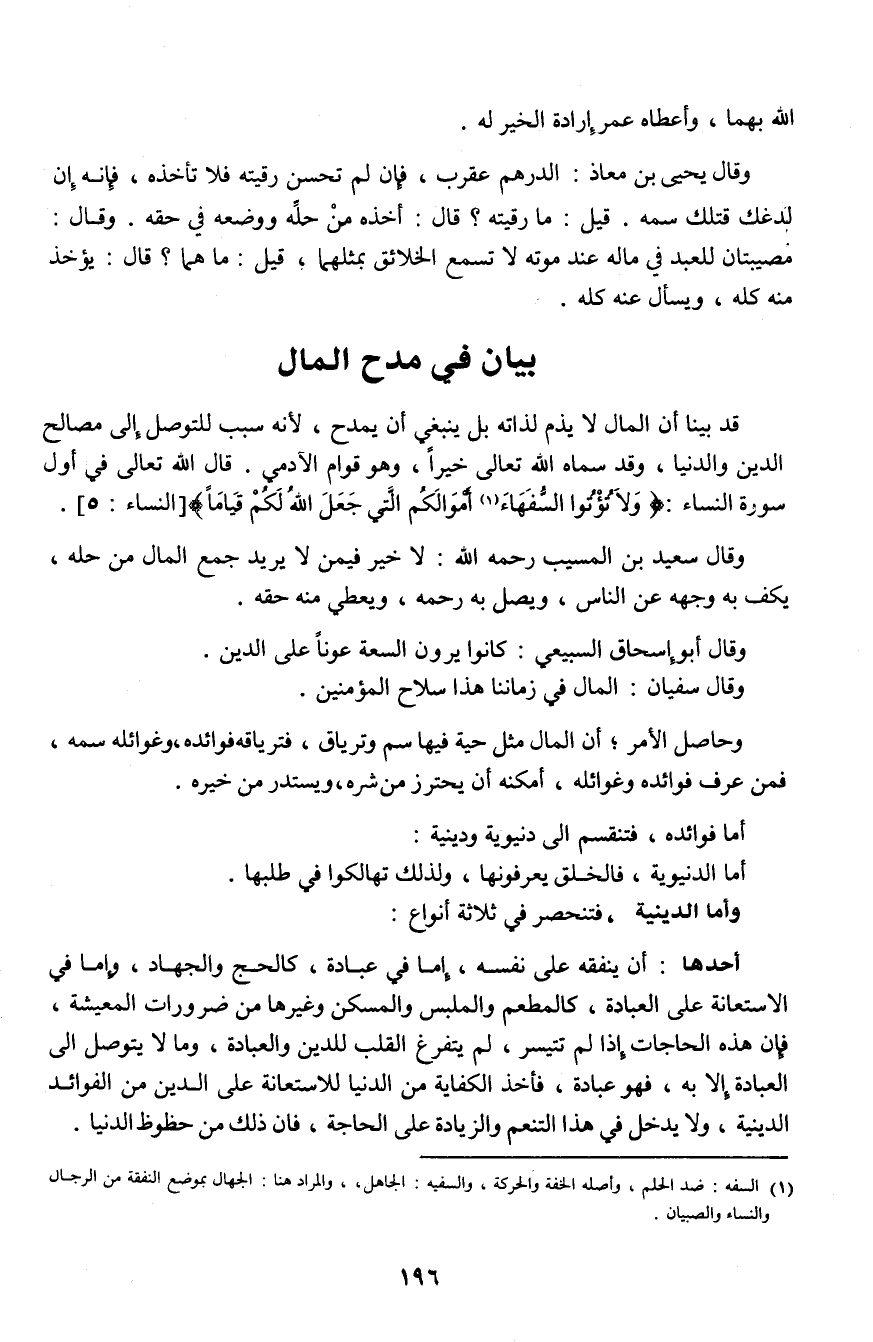 قد بينا أن المال لا يذم لذاته بل ينبغي أن يمدح، لأنه سبب للتوصل إلى مصالح الدين والدنيا، وقد سماه الله تعالى خيراً، وهو قوام الآدمي. قال الله تعالى في أول سورة النساء: {وَلَا تُؤْتُوا السُّفَهَاءَ (¬1) أَمْوَالَكُمُ الَّتِي جَعَلَ اللَّهُ لَكُمْ قِيَامًا} [النساء: 5].