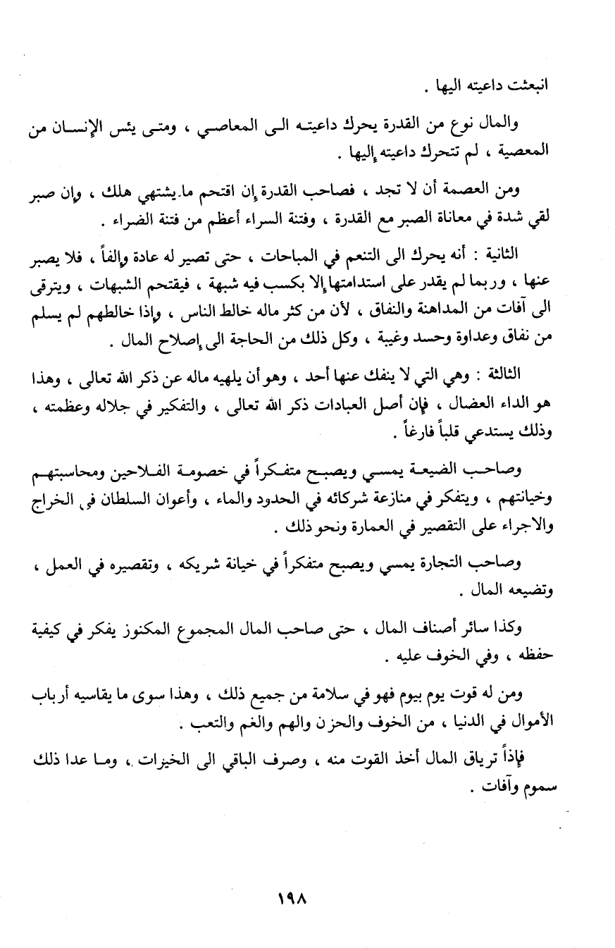 الثالثة: وهى التي لا ينفك عنها أحد، وهو أن يلهيه ماله عن ذكر الله تعالى، وهذا هو الداء العضال، فإن أصل العبادات ذكر الله تعالى، والتفكير في جلاله وعظمته، وذلك يستدعى قلباً فارغاً.