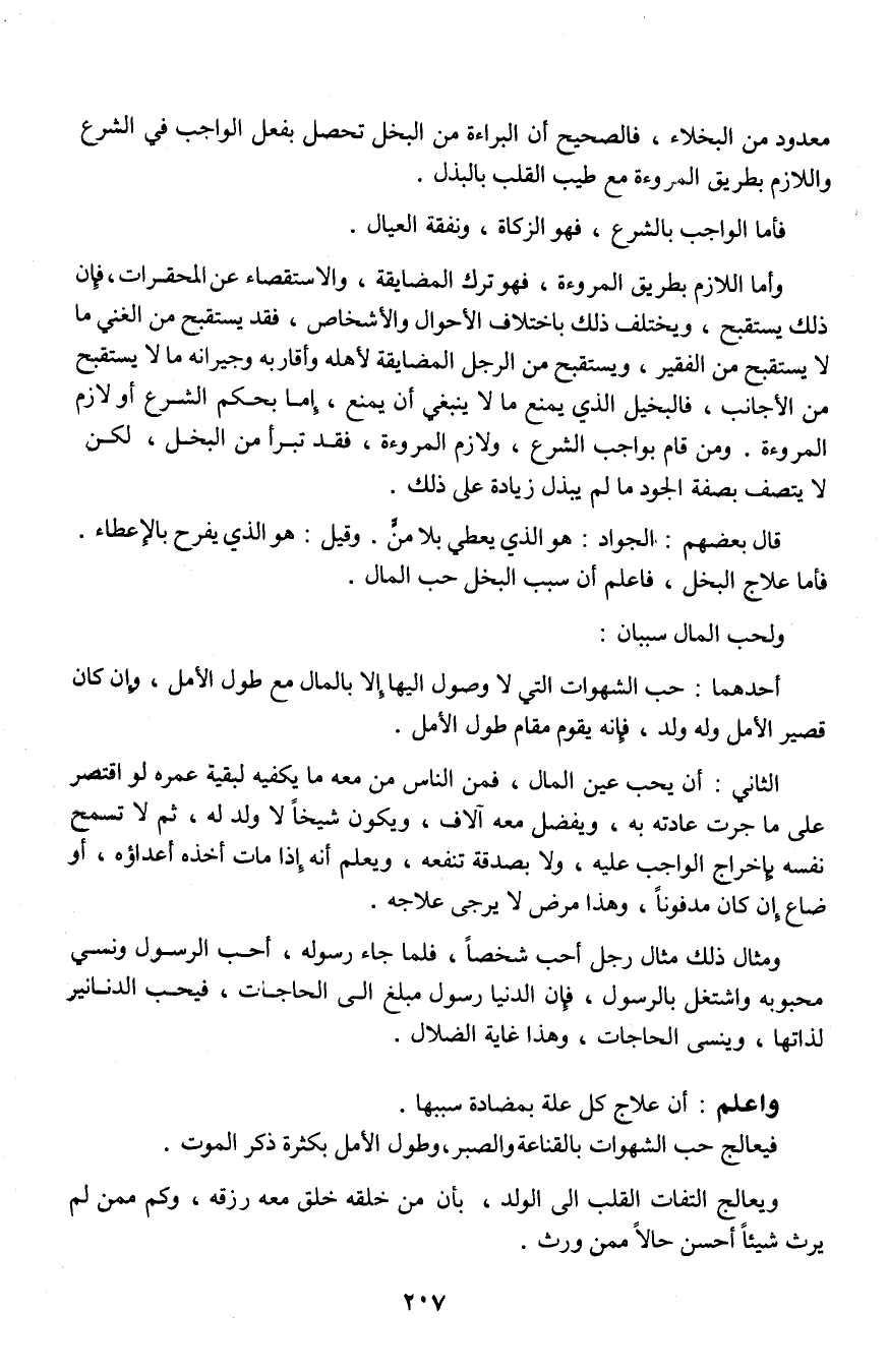 الثاني: أن يحب عين المال، فمن الناس من معه ما يكفيه لبقية عمره لو اقتصر على ما جرت عادته به، ويفضل معه آلاف، ويكون شيخاً لا ولد له، ثم لا تسمح نفسه بإخراج الواجب عليه، ولا بصدقة تنفعه، ويعلم أنه إذا مات أخذه أعداؤه، أو ضاع إن كان مدفوناً، وهذا مرض لا يرجى علاجه.
