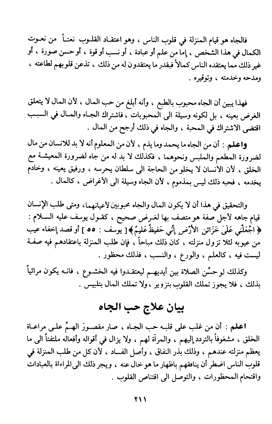 فبهذا يبين أن الجاه محبوب بالطبع وأنه أبلغ من حب المال، لأن المال لا يتعلق الغرض بعينه، بل لكونه وسيلة إلى المحبوبات، فاشتراك الجاه والمال في السبب اقتضى الاشتراك في المحبة، والجاه في ذلك أرجح من المال.