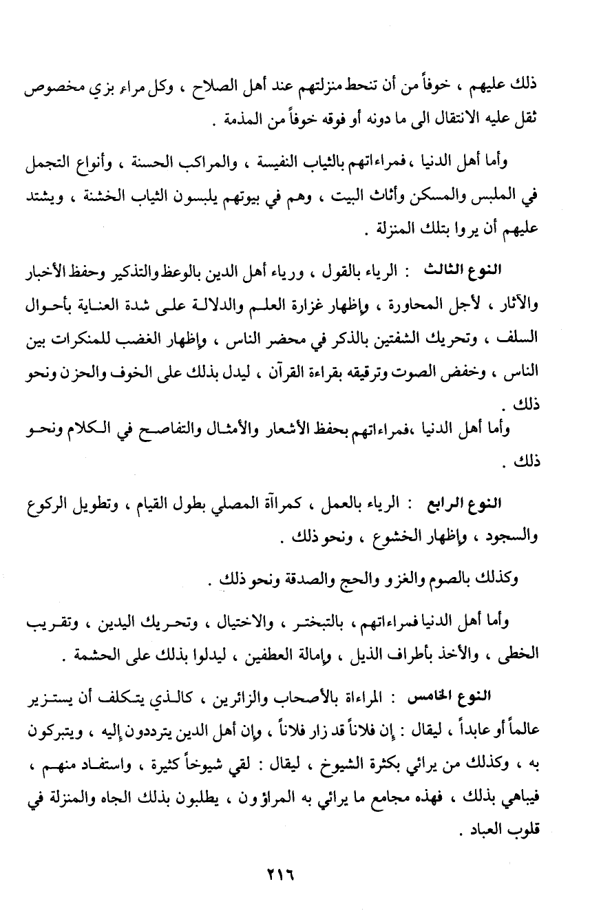 النوع الخامس: المراءاة بالأصحاب والزائرين، كالذي يتكلف أن يستزير عالماً أو عابداً، ليقال: إن فلاناً قد زار فلاناً، وإن أهل الدين يترددون إليه، ويتبركون به، وكذلك من يرائي بكثرة الشيوخ، ليقال: لقي شيوخاً كثيرة، واستفاد منهم، فيباهى بذلك، فهذه مجامع ما يرائي به المراؤون، يطلبون بذلك الجاه والمنزلة في قلوب العباد.