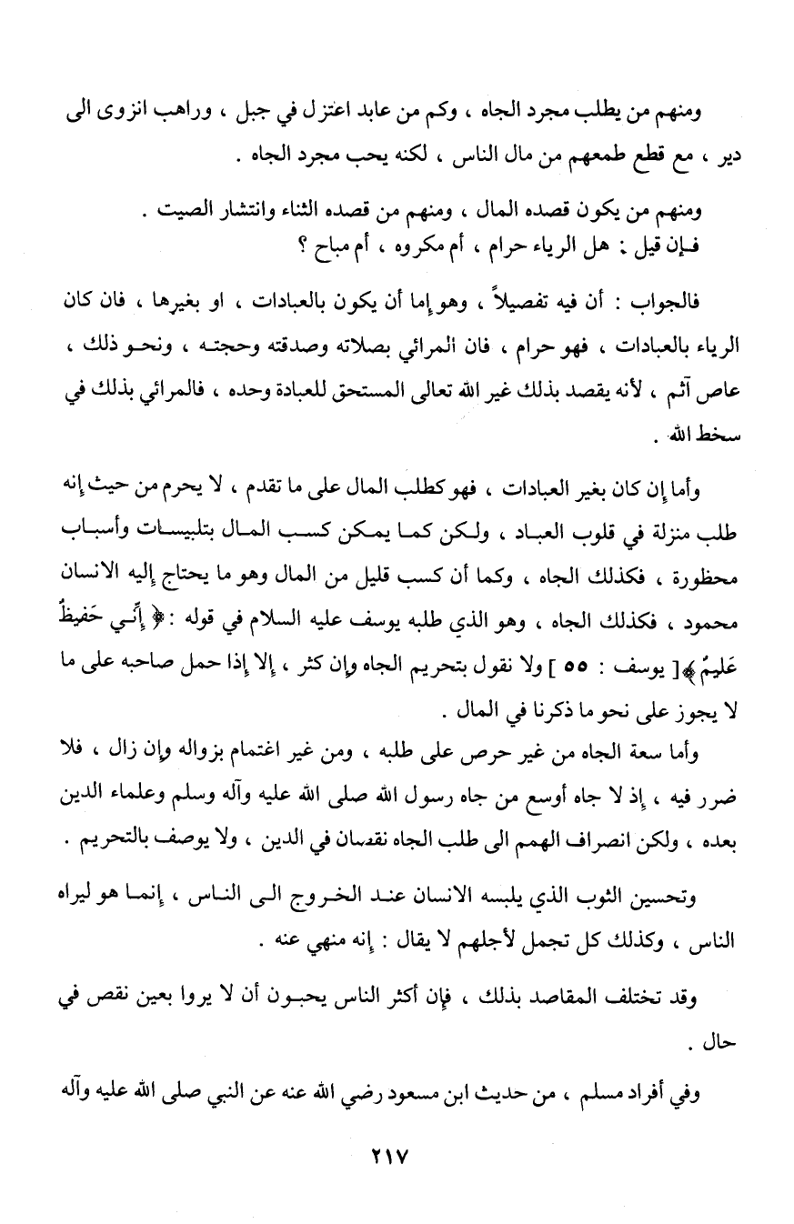 وأما إن كان بغير العبادات، فهو كطلب المال على ما تقدم، لا يحرم من حيث إنه طلب منزلة في قلوب العباد، ولكن كما يمكن كسب المال بتلبيسات وأسباب محظورة، فكذلك الجاه، وكما أن كسب قليل من المال وهو الذي طلبه يوسف عليه السلام في قوله: {إِنِّي حَفِيظٌ عَلِيمٌ} [يوسف: 55] ولا نقول بتحريم الجاه وإن كثر، إلا إذا حمل صاحبه على ما لا يجوز على نحو ما ذكرنا في المال.