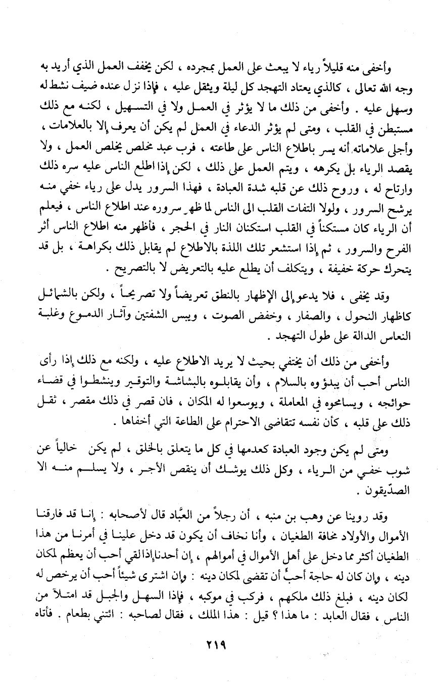 وقد روينا عن وهب بن منبه، أن رجلاً من العباد قال لأصحابه: إنا قد فارقنا الأموال والأولاد مخافة الطغيان، وأنا نخاف أن يكون قد دخل علينا في أمرنا من هذا الطغيان أكثر مما دخل على الأهل الأموال في أموالهم، إن أحدنا إذا لقي أحب أن يعظم لمكان دينه، وإن كان له حاجة أحب أن تقضى لمكان دينه: وإن اشترى شئياً أحب أن يرخص له لمكان دينه، فبلغ ذلك ملكهم، فركب في موكبه، فإذا السهل والجبل قد امتلأ من الناس، فقال العابد: ما هذا؟ قيل: هذا الملك، فقال لصاحبه: ائتني بطعام، فأتاه