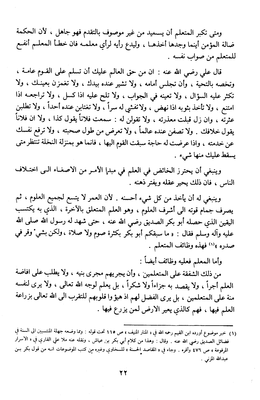 أبو بكر الصديق رضى الله عنه، حتى شهد له رسول الله صلى الله عليه وآله وسلم فقال: "ما سبقكم أبو بكر بكثرة صوم ولا صلاة، ولكن بشيء وقر فى صدره" (¬1) فهذه وظائف المتعلم.