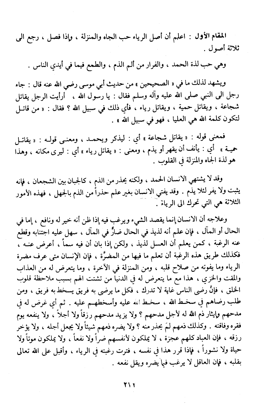 المقام الأول: اعلم أن أصل الرياء حب الجاه والمنزلة، وإذا فصل، رجع إلى ثلاثة أصول.