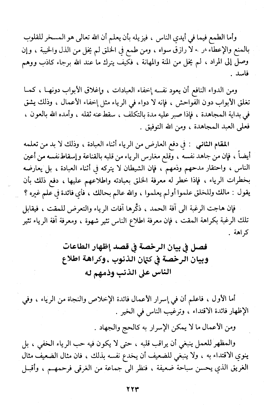 5 ـ فصل في بيان الرخصة في قصد إظهار الطاعات وبيان الرخصة في كتمان الذنوب، وكراهة اطلاع الناس على الذنب وذمهم له