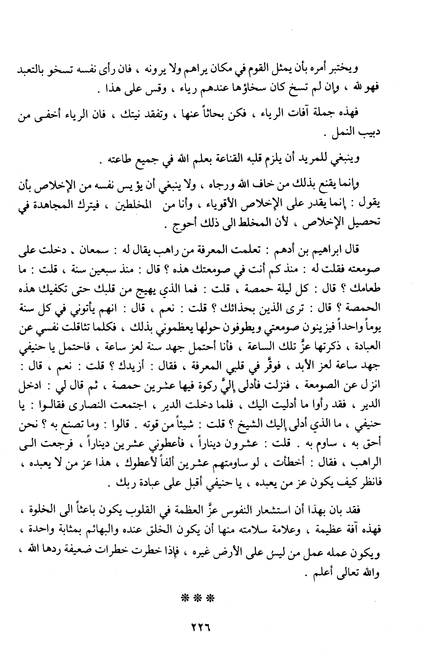 ويختبر أمره بأن يمثل القوم في مكان يراهم ولا يرونه، فإن رأى نفسه تسخو بالتعبد فهو لله، وإن لم تسخ كان سخاؤها عندهم رياء، وقس على هذا.