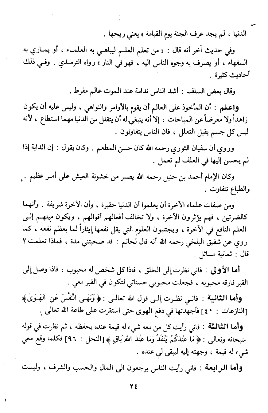 ومن صفات علماء الآخرة أن يعلموا أن الدنيا حقيرة، وأن الآخرة شريفة. وأنهما كالضرتين، فهم يؤثرون الآخرة، ولا تخالف أفعالهم أقوالهم، ويكون ميلهم إلى العلم النافع فى الآخرة، ويجتنبون العلوم التي يقل نفعها إيثاراً لما يعظم نفعه، كما روي عن شقيق البلخي رحمه الله أنه قال لحاتم: قد صحبتني مدة، فماذا تعلمت؟