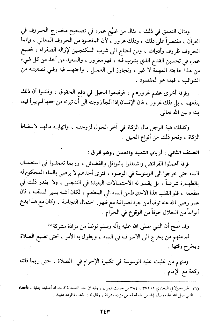 فرقة أهملوا الفرائض واشتغلوا بالنوافل الفضائل، وربما تعمقوا في استعمال الماء حتى خرجوا إلى الوسوسة في الوضوء، فترى أحدهم لا يرضى بالماء المحكوم له بالطهارة شرعاً، بل يقدر الاحتمالات البعيدة في التنجس، ولا يقدر ذلك في مطعمه، فلو انقلب هذا الاحتياط من الماء إلى المطعم، لكان أشبه بسير السلف، فإن عمر رضى الله عنه توضأ من جرة نصرانية مع ظهور احتمال النجاسة، وكان مع هذا يدع أنواعاً من الحلال خوفاً من الوقوع في الحرام.