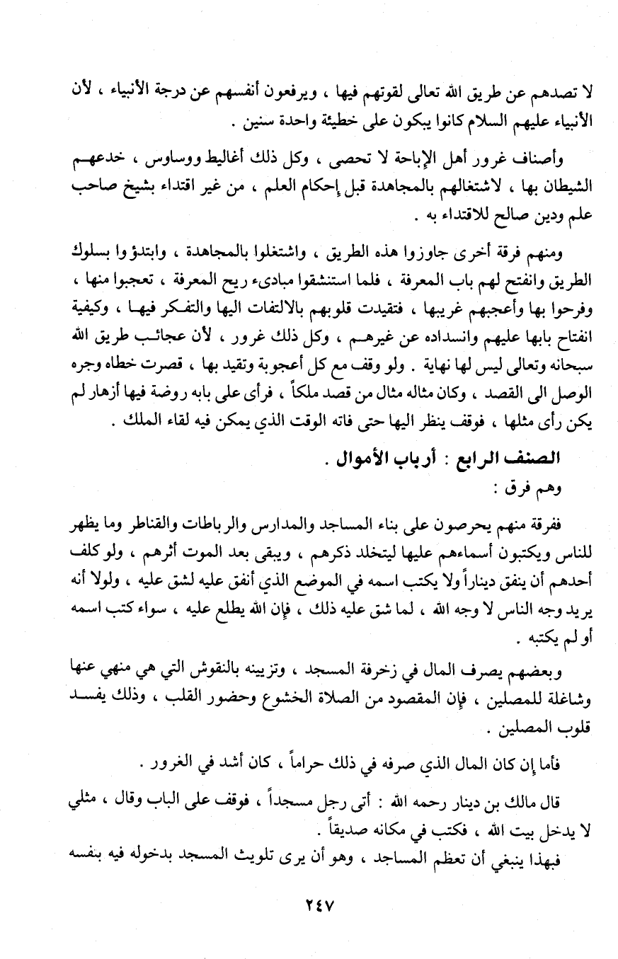 ففرقة منهم يحرصون على بناء المساجد والمدارس والرباطات والقناطر وما يظهر للناس ويكتبون أسماءهم عليها ليتخلد ذكرهم، ويبقى بعد الموت أثرهم، ولو كلف أحدهم أن ينفق ديناراً ولا يكتب اسمه في الموضع الذي أنفق عليه لشق عليه، ولولا أنه يريد وجه الناس لا وجه الله، لما شق عليه ذلك، فإن الله يطلع عليه، سواء كتب اسمه أو لم يكتبه.