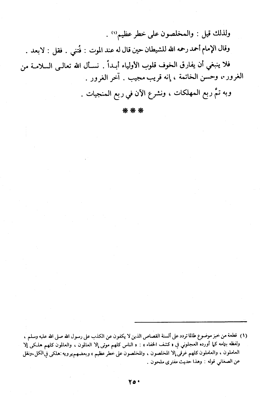 (¬1) قطعة من خبز موضوع طالما تردد على ألسنة القصاص الذين لا يكفون عن الكذب على رسول الله صلى الله عليه وسلم، ولفظه بتمامه كما أورده العجلوني في "كشف الخفاء": "الناس كلهم موتى، إلا العالمون، والعالمون كلهم هلكى إلا العاملون، والعاملون كلهم غرقى إلا المخلصون، والمخلصون على خطر عظيم" وبعضهم يرويه: هلكى في الكل، ونقل عن الصغاني قوله: وهذا حديث مفترى ملحون.